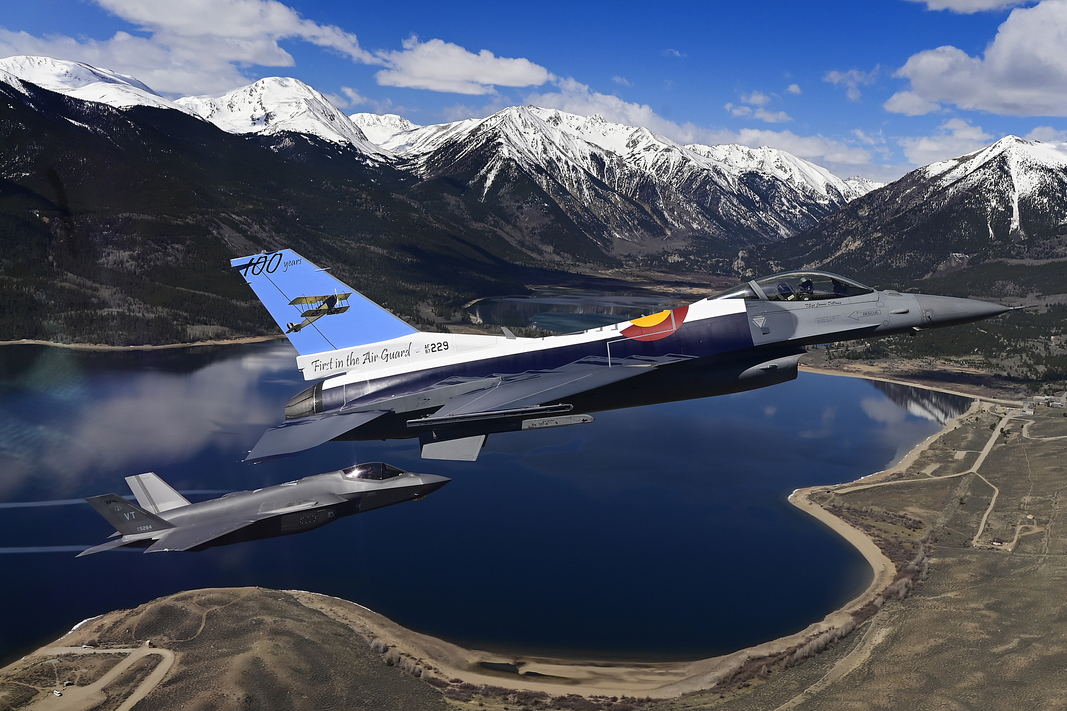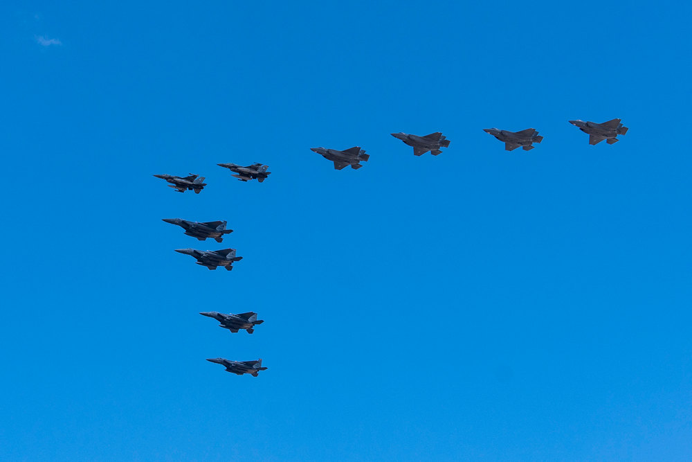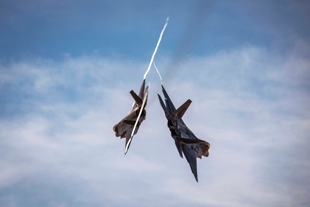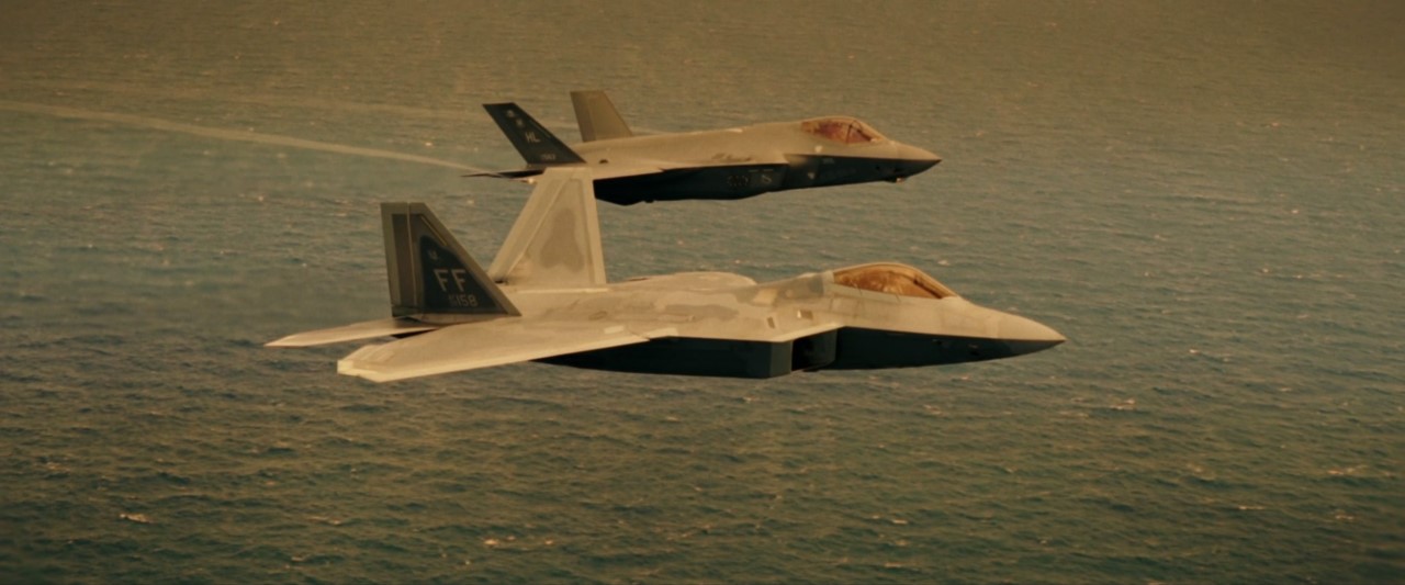 un Lockheed Martin F-35 Lightning II. Un Lockheed Martin F-35 Lightning II en arrière-plan avec le code de queue HL (Hill AFB, Utah - 388th Fighter Wing). Le Lockheed Martin F-22 Raptor est orné du code de queue FF (1ère escadre de chasse).