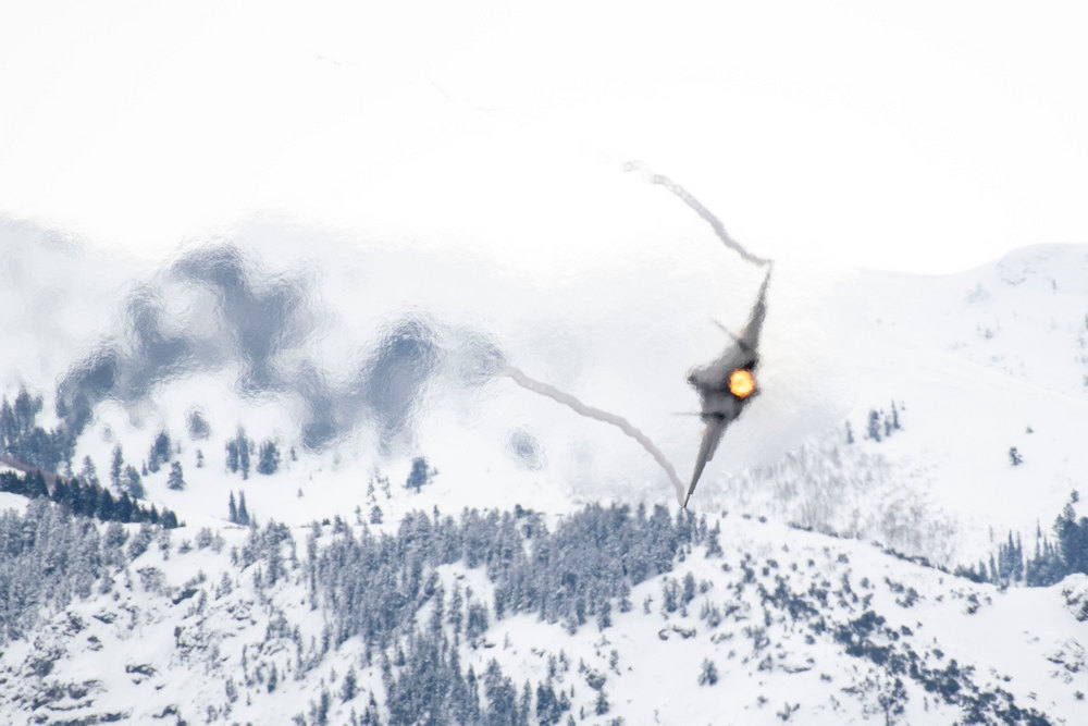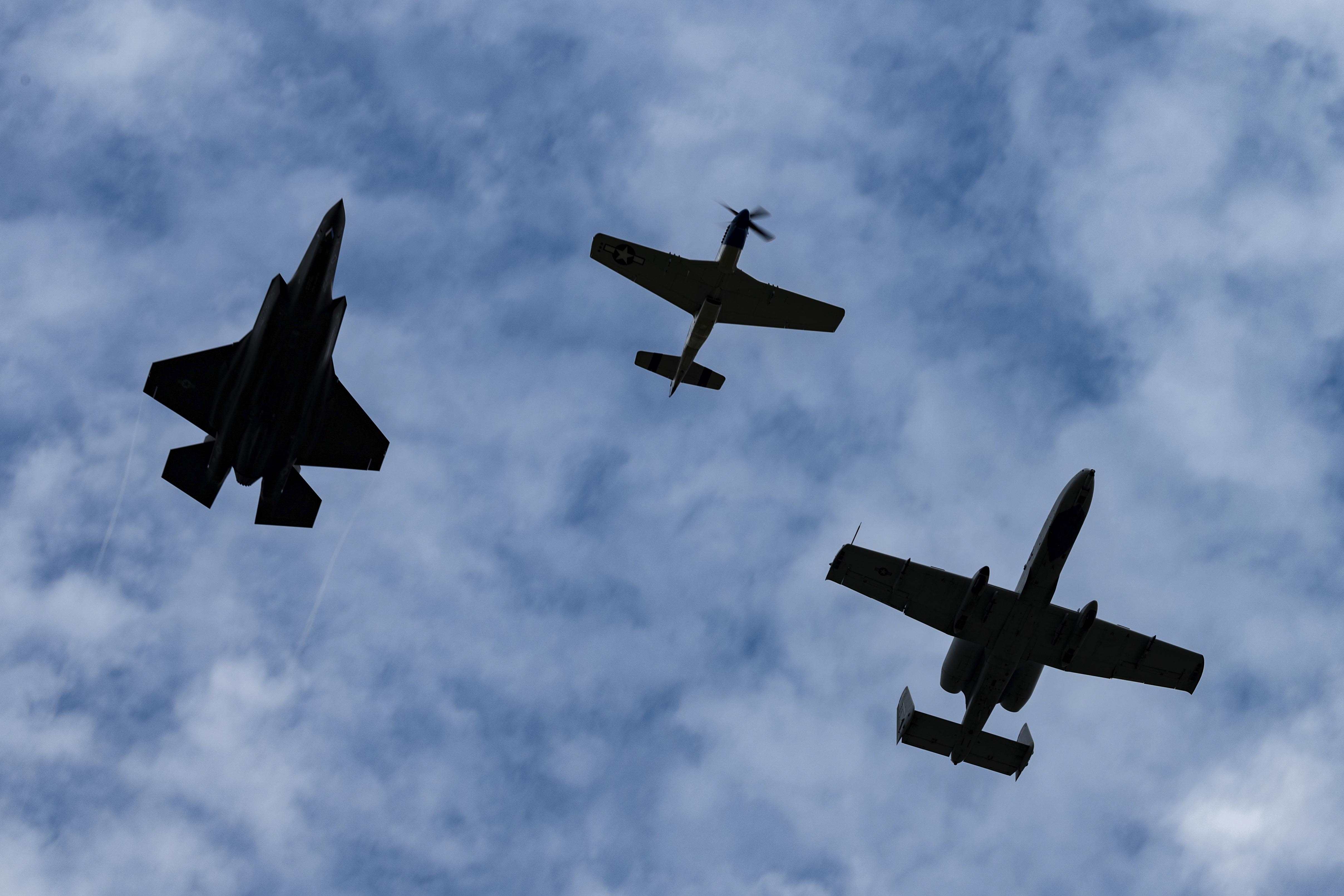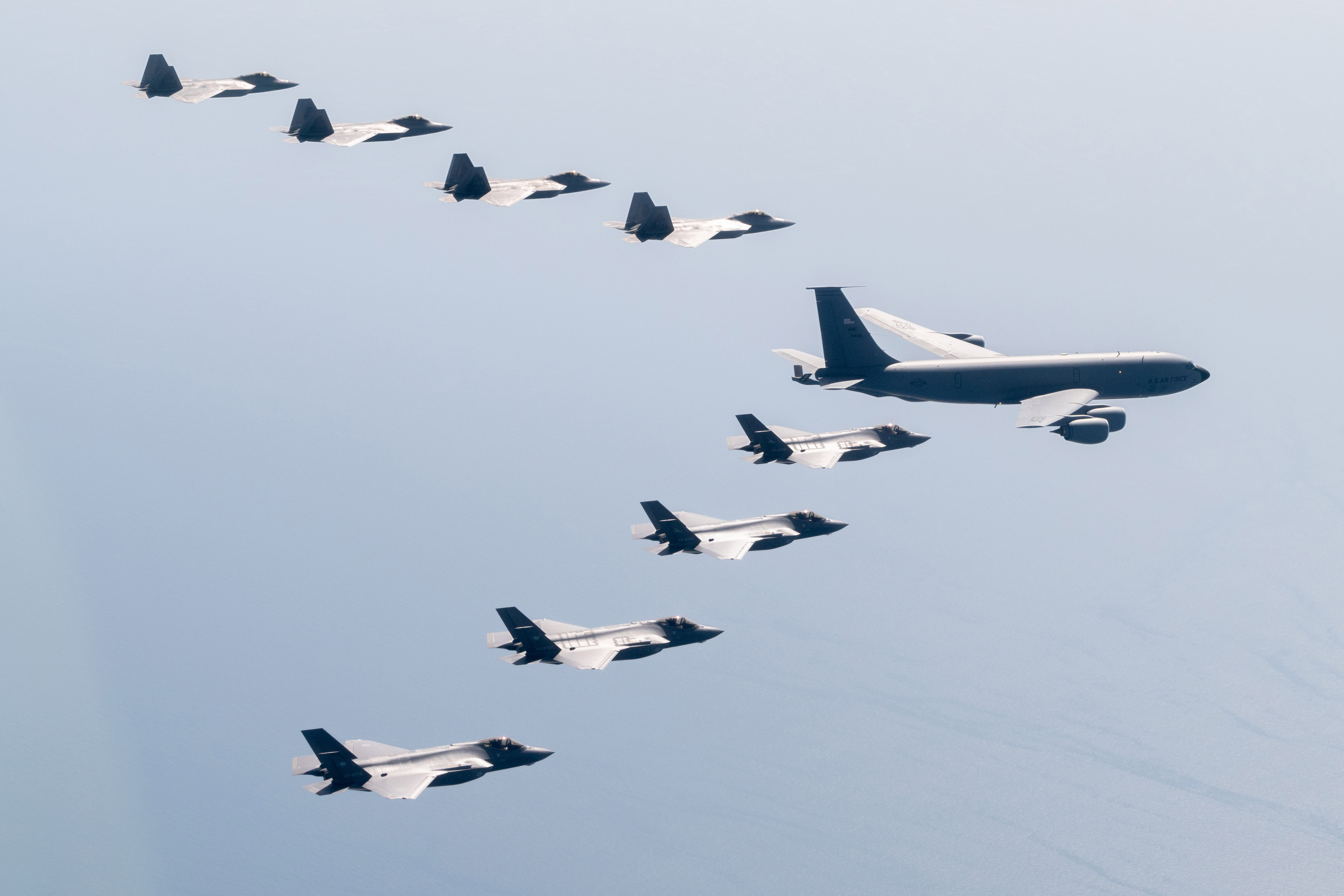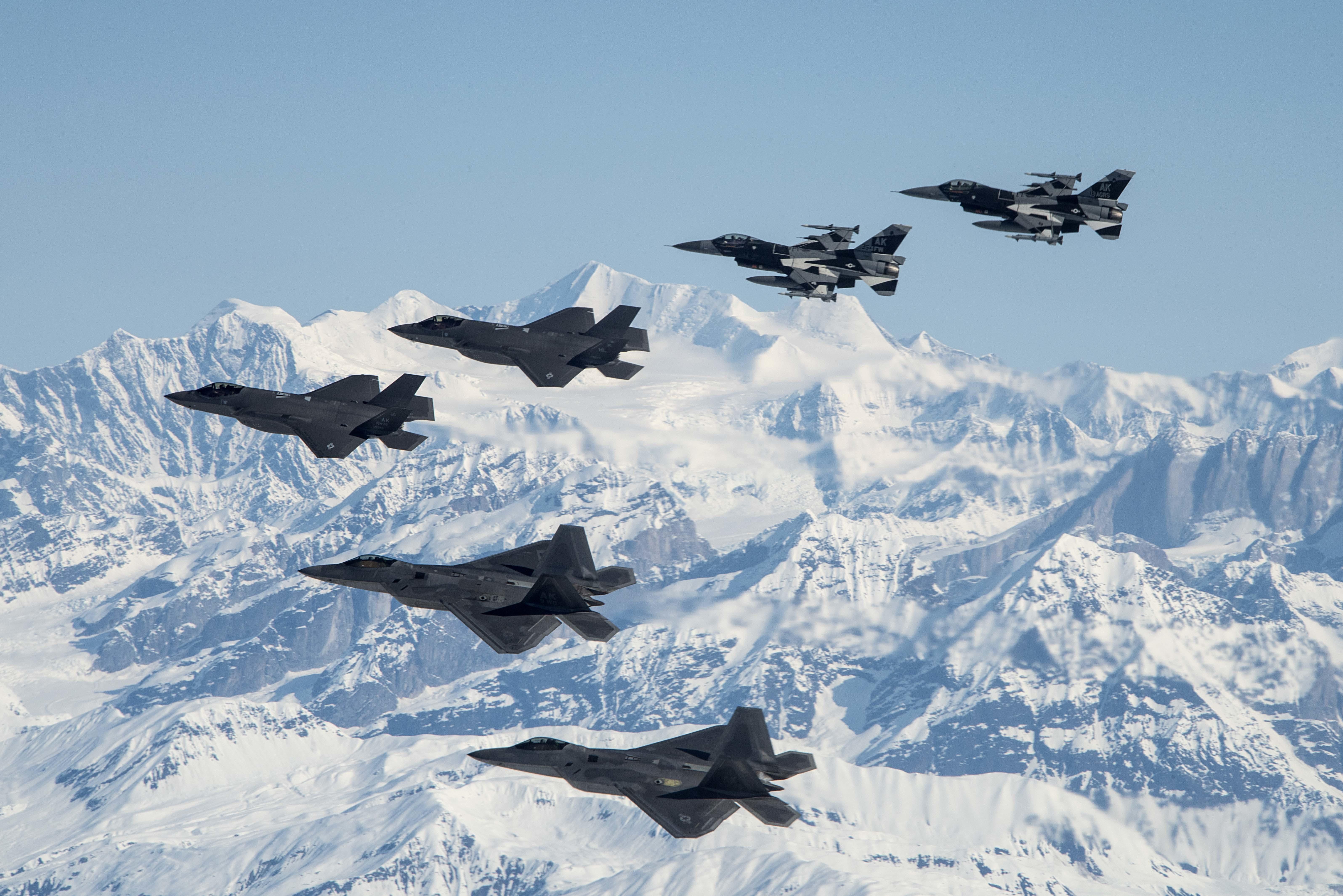 un Lockheed Martin F-35 Lightning II. Un Lockheed Martin F-35 Lightning II en arrière-plan avec le code de queue HL (Hill AFB, Utah - 388th Fighter Wing). Le Lockheed Martin F-22 Raptor est orné du code de queue FF (1ère escadre de chasse).