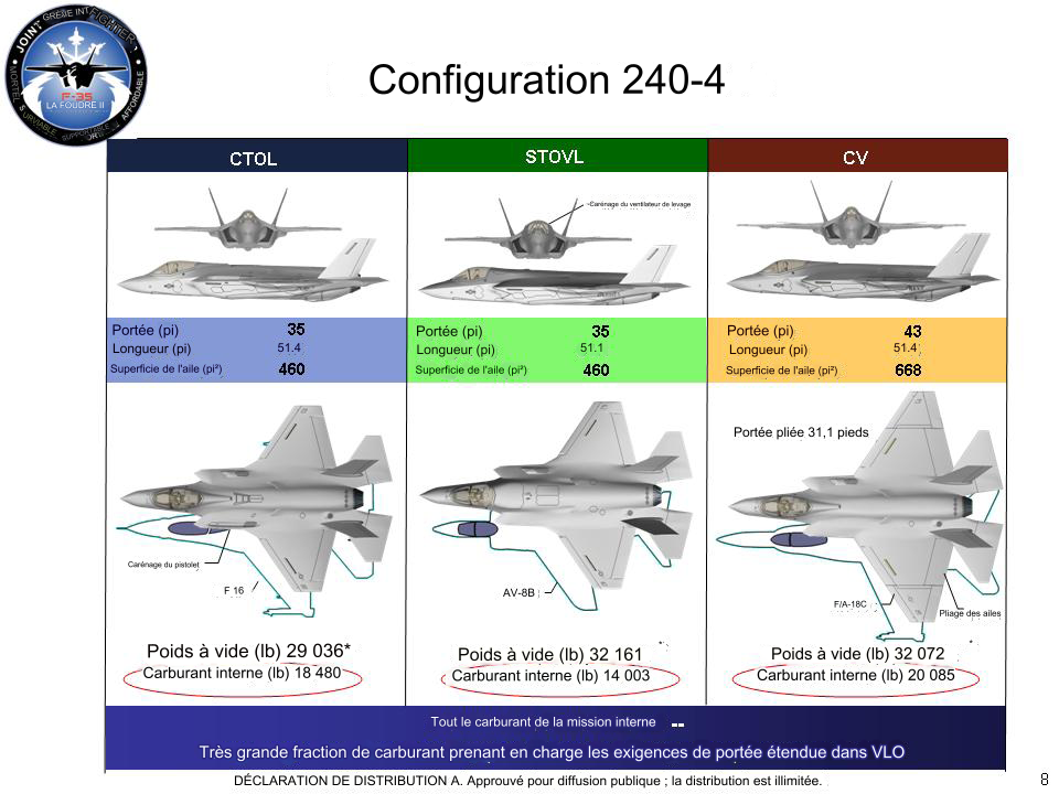 Le F-35 a une configuration aile-queue avec 2 stabilisateurs verticaux inclinés pour la furtivité. Les gouvernes de vol comprennent les volets de bord d’attaque, les flaperons, les gouvernes de direction et les empennages horizontaux mobiles (stabilisateurs). Les extensions d’emplanture de bord d’attaque ou bouchains se dirigent également vers l’avant jusqu’aux entrées. L’envergure relativement courte de 35 pieds du F-35A et du F-35B est fixée par l’exigence de s’adapter à l’intérieur des aires de stationnement et des ascenseurs des navires d’assaut amphibies de l’USN. L’aile plus grande du F-35C est plus économe en carburant. Les entrées supersoniques fixes sans déviateur (DSI) utilisent une surface de compression bosselée et un capot incliné vers l’avant pour éloigner la couche limite de l’avant-corps des entrées, qui forment un conduit en Y pour le moteur. Structurellement, le F-35 s’est inspiré des leçons du F-22. Les composites représentent 35% du poids de la cellule de l’avion, la majorité étant constituée de bismaléimide et de matériaux époxy composites, ainsi que d’un peu d’époxy renforcé de nanotubes de carbone dans les lots de production ultérieurs. Le F-35 est considérablement plus lourd que les chasseurs légers qu’il remplace, la variante la plus légère ayant une masse à vide de 29'300 lb (13'300 kg). Une grande partie du poids peut être attribuée aux compartiments d’armes internes et à l’avionique étendue transportée.