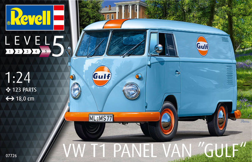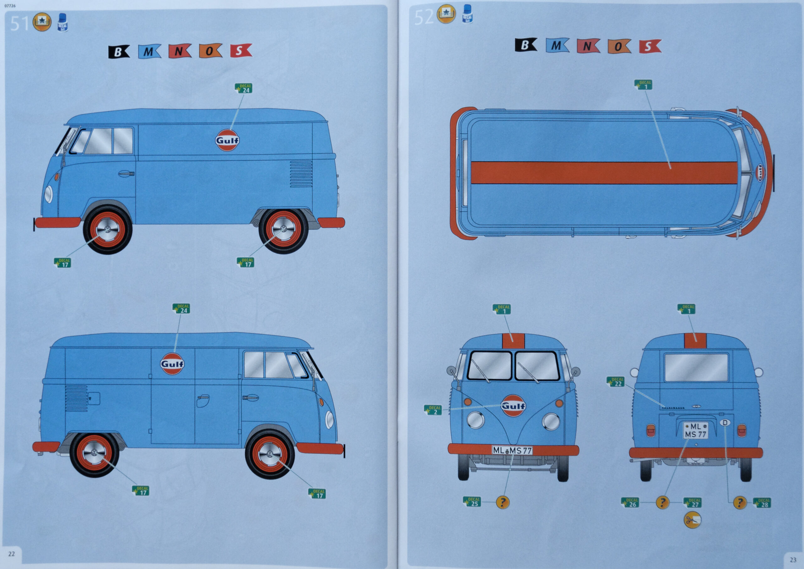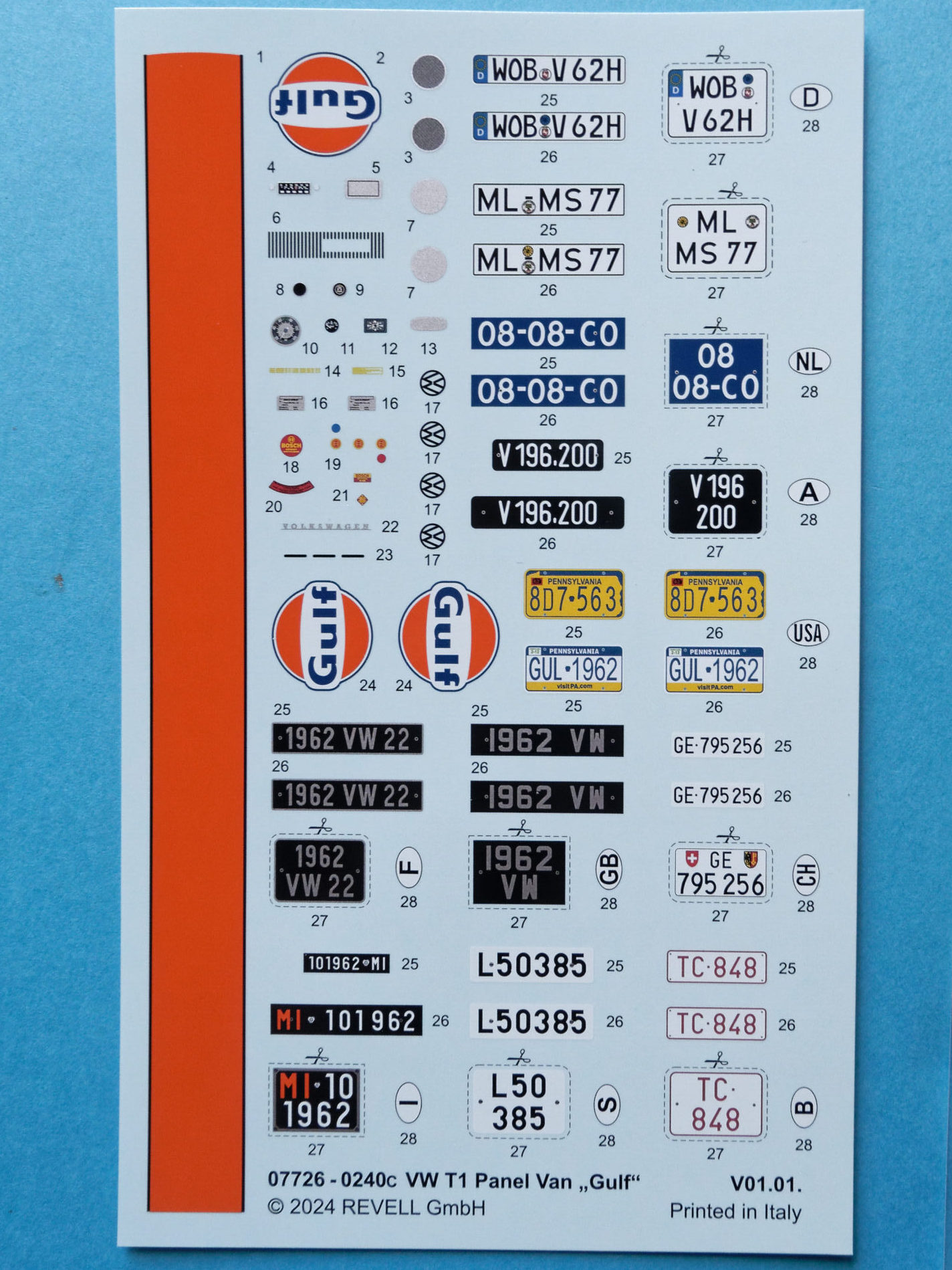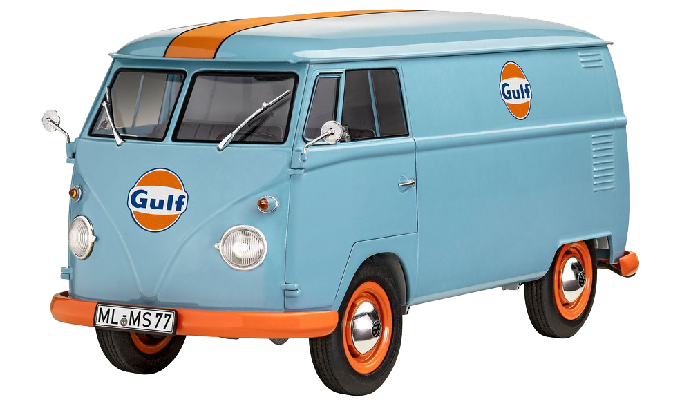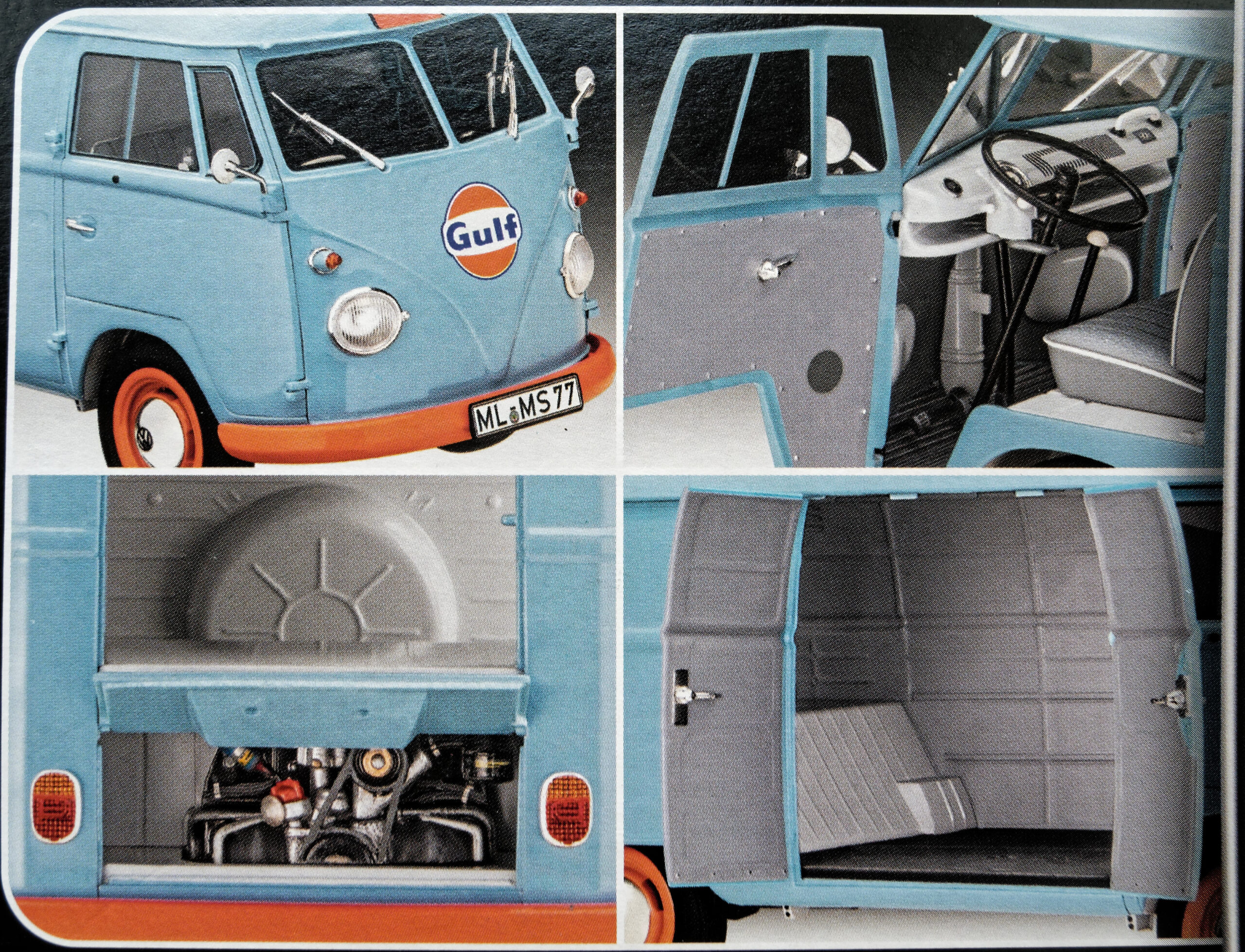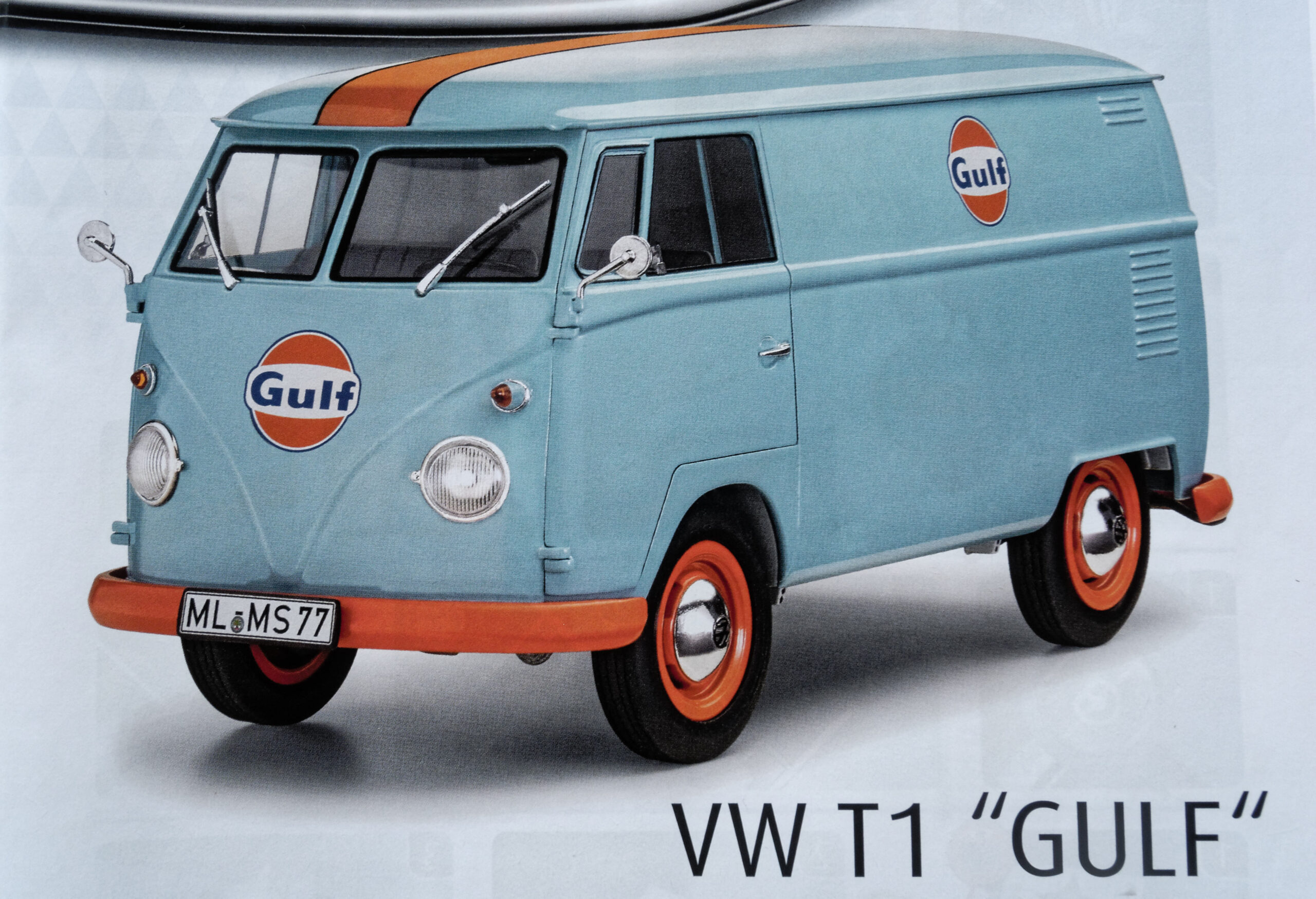 Avant que ce kit ne soit lancé pour la première fois en 2000 en tant que bus Samba de Revell, ce T1 était déjà disponible chez Hasegawa en 1997. Entre-temps, Revell a ajouté de nombreuses versions de ce véhicule, y compris la version camping, mais a également révisé et affiné de nombreux détails pendant la production. Ces petits changements, au cours de la production de l’original, ont également été pris en compte dans les différents modèles Revell. Ici, par exemple, la forme des feux arrière ainsi que des clignotants avant sont une indication d’une version précoce ou ultérieure. Ceux-ci étaient initialement coniques et ce n’est que dans les dernières années de construction qu’ils ont été installés en forme ovale. Le kit décrit ici est la version qui a été produite à partir de 1960 et qui est fourni avec de la publicité de la société « Gulf Öl ». Cette entreprise a connu un grand succès dans le sport automobile international dans les années 60 et 70 et est encore connue aujourd’hui pour sa combinaison de couleurs distinctive.