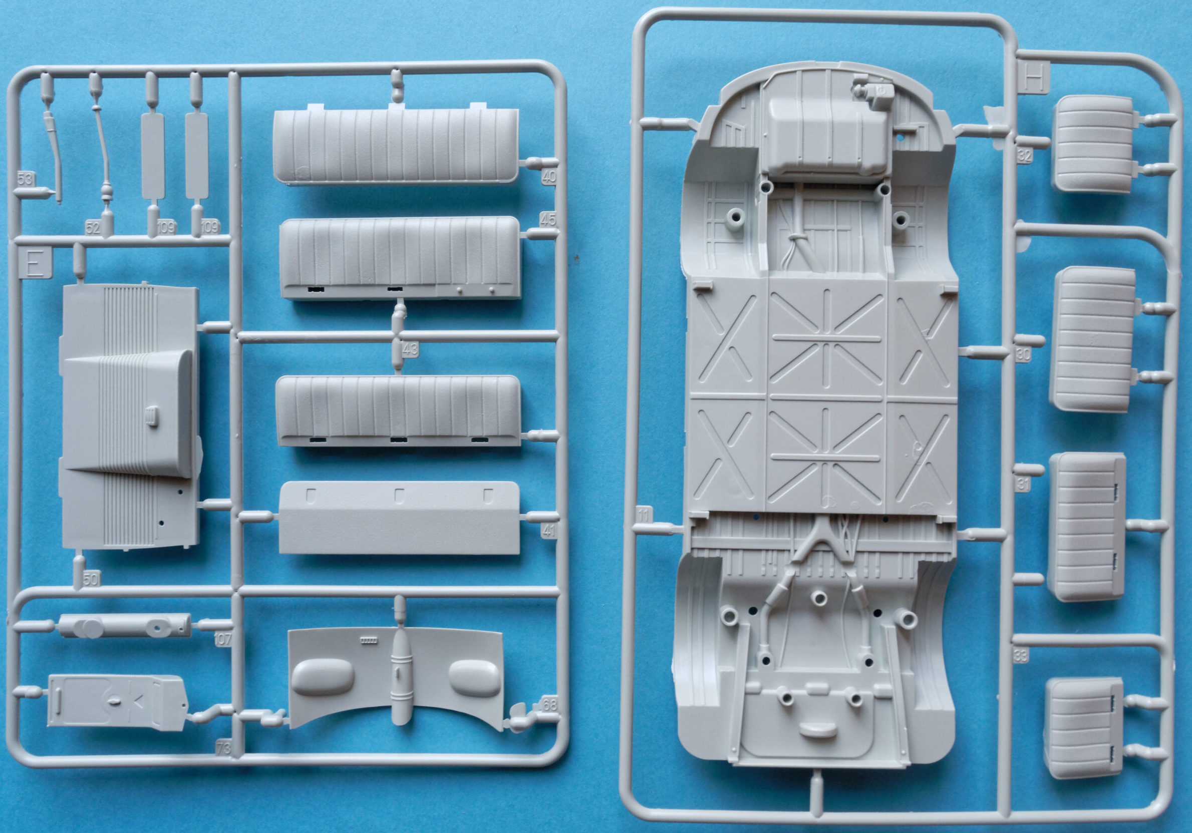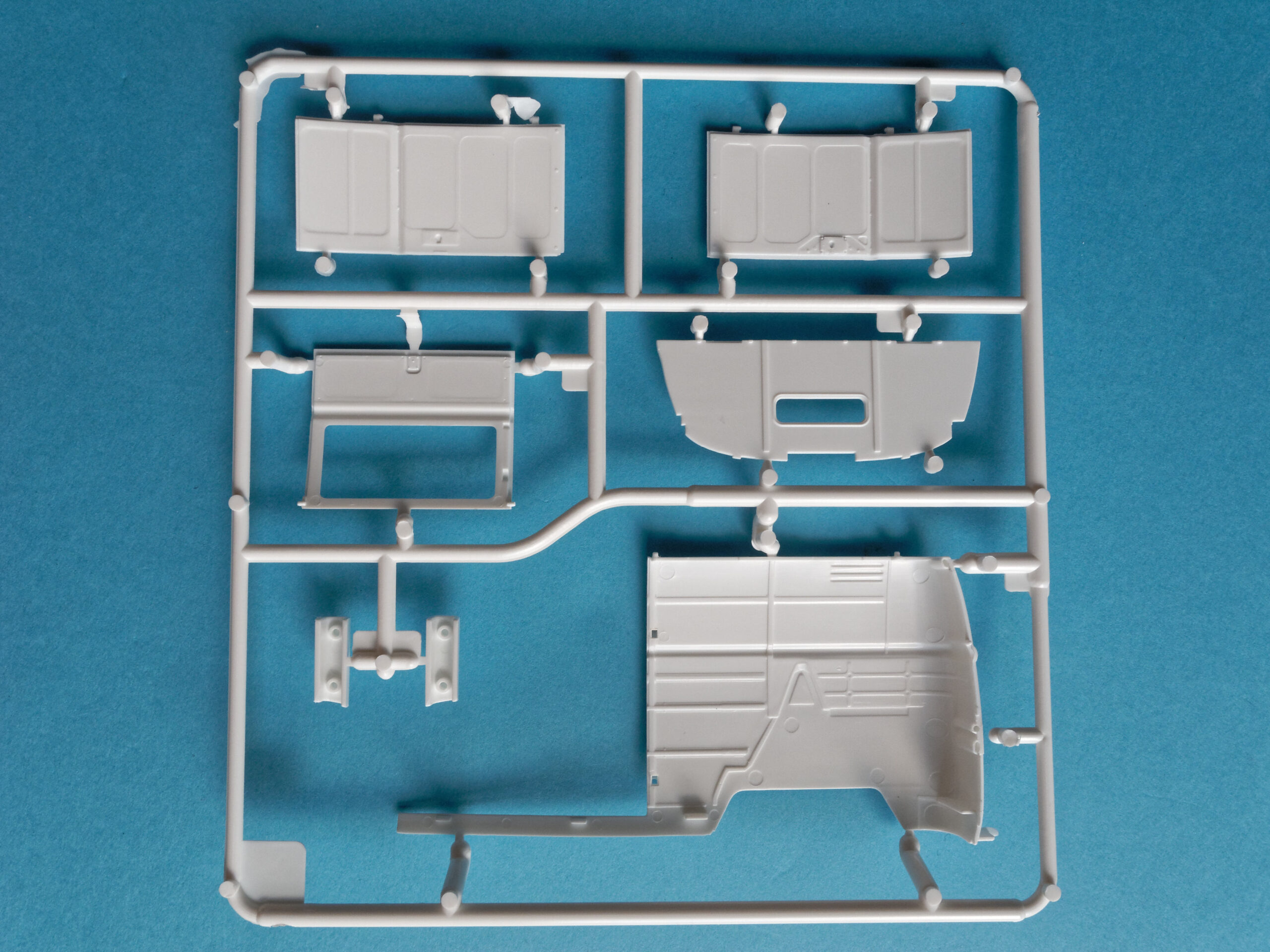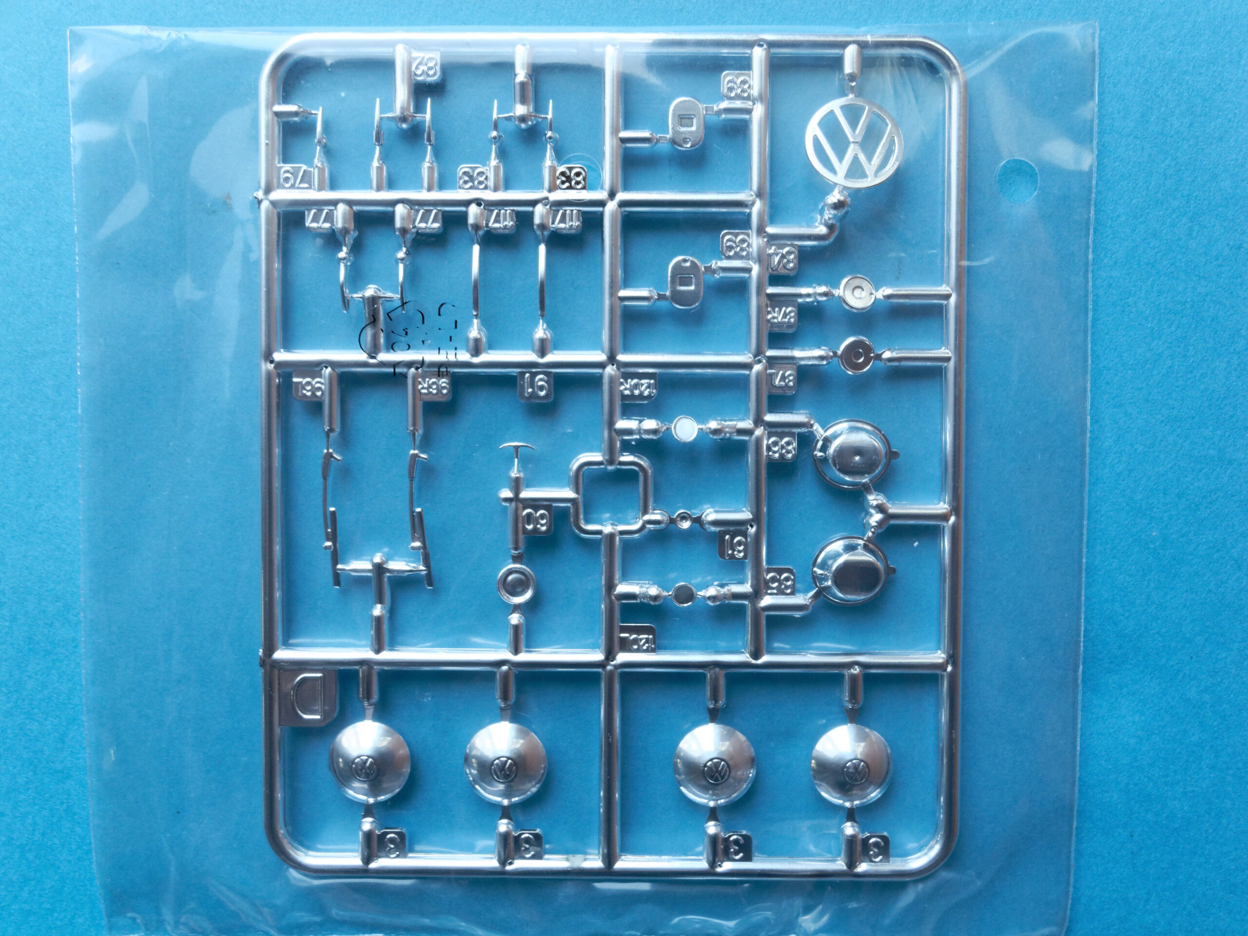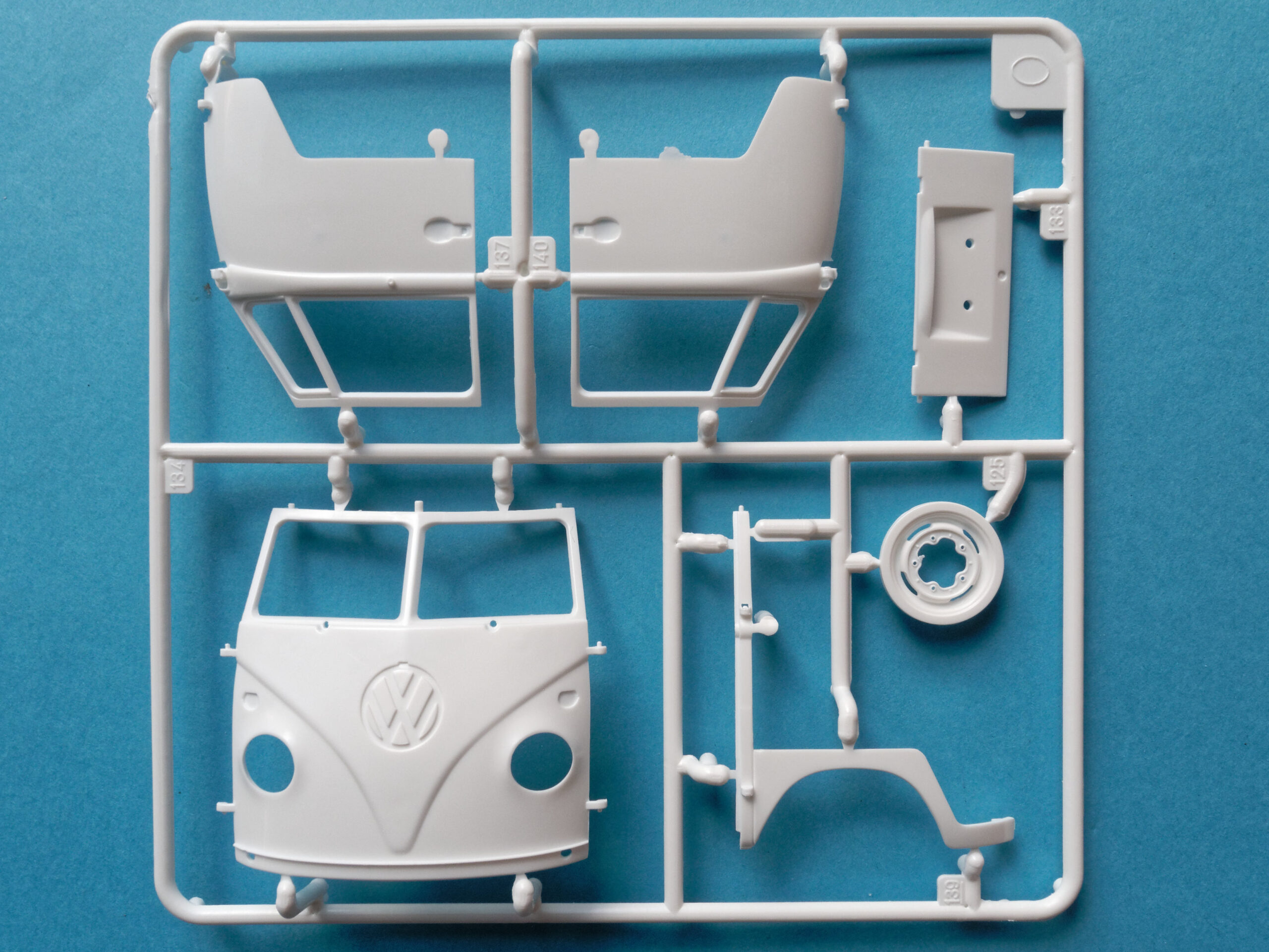 Le kit est fourni avec de nombreux détails et fonctionnalités. En plus de l’intérieur complet et de l’espace de chargement, toutes les portes peuvent être ouvertes et le moteur bien mis en œuvre est également présent ici. Au total, 9 pièces moulées doivent être traitées pour l’assemblage. Ceux-ci sont pulvérisés dans du plastique blanc, vaporisé de chrome, gris et argenté. Les 2 grappes transparentes contiennent des disques pour toutes les versions proposées de ce T1 et bien-sûr, toutes ne sont pas nécessaires ici. De plus, il y a 5 roues en vinyle et un arc en plastique flexible transparent.