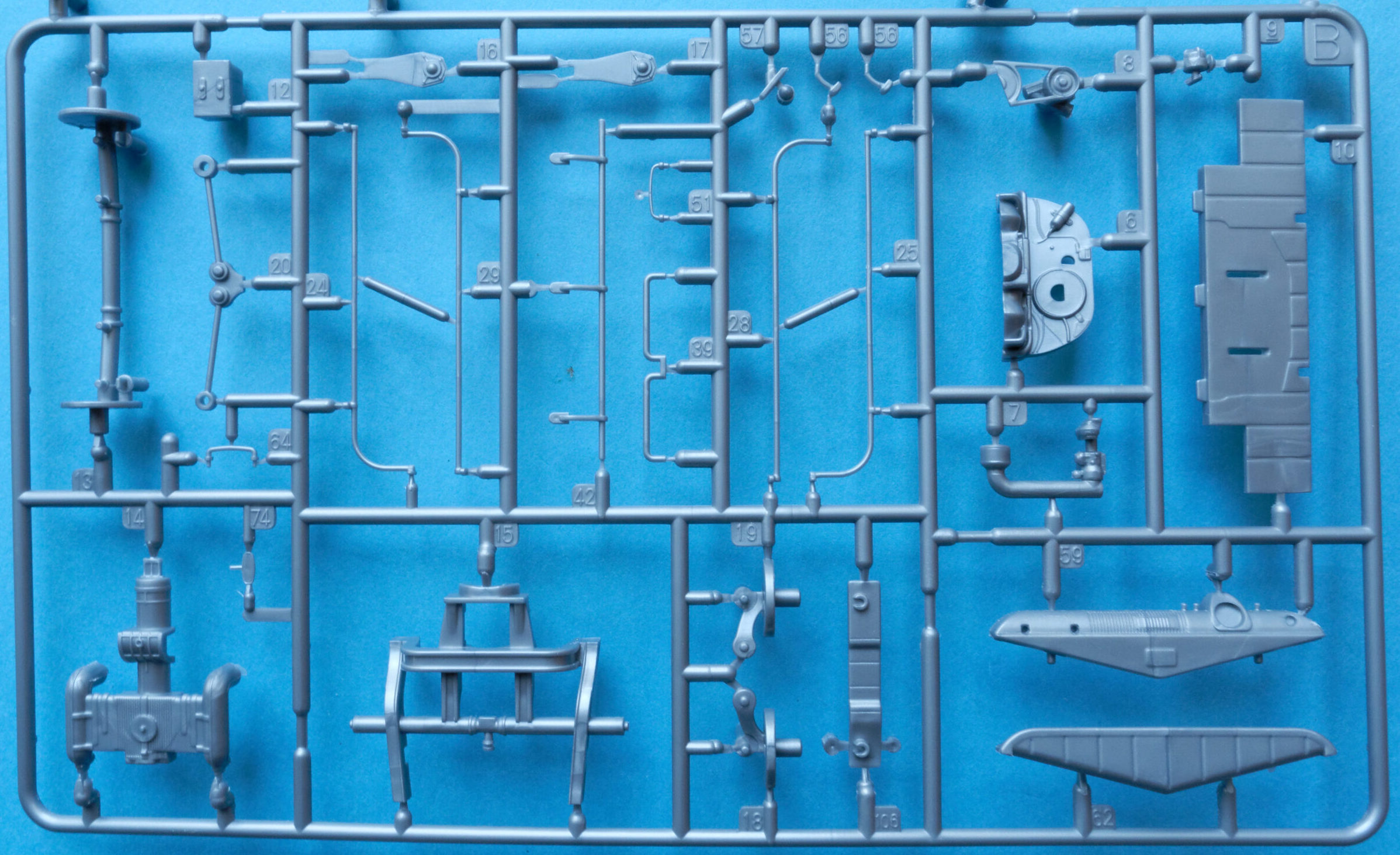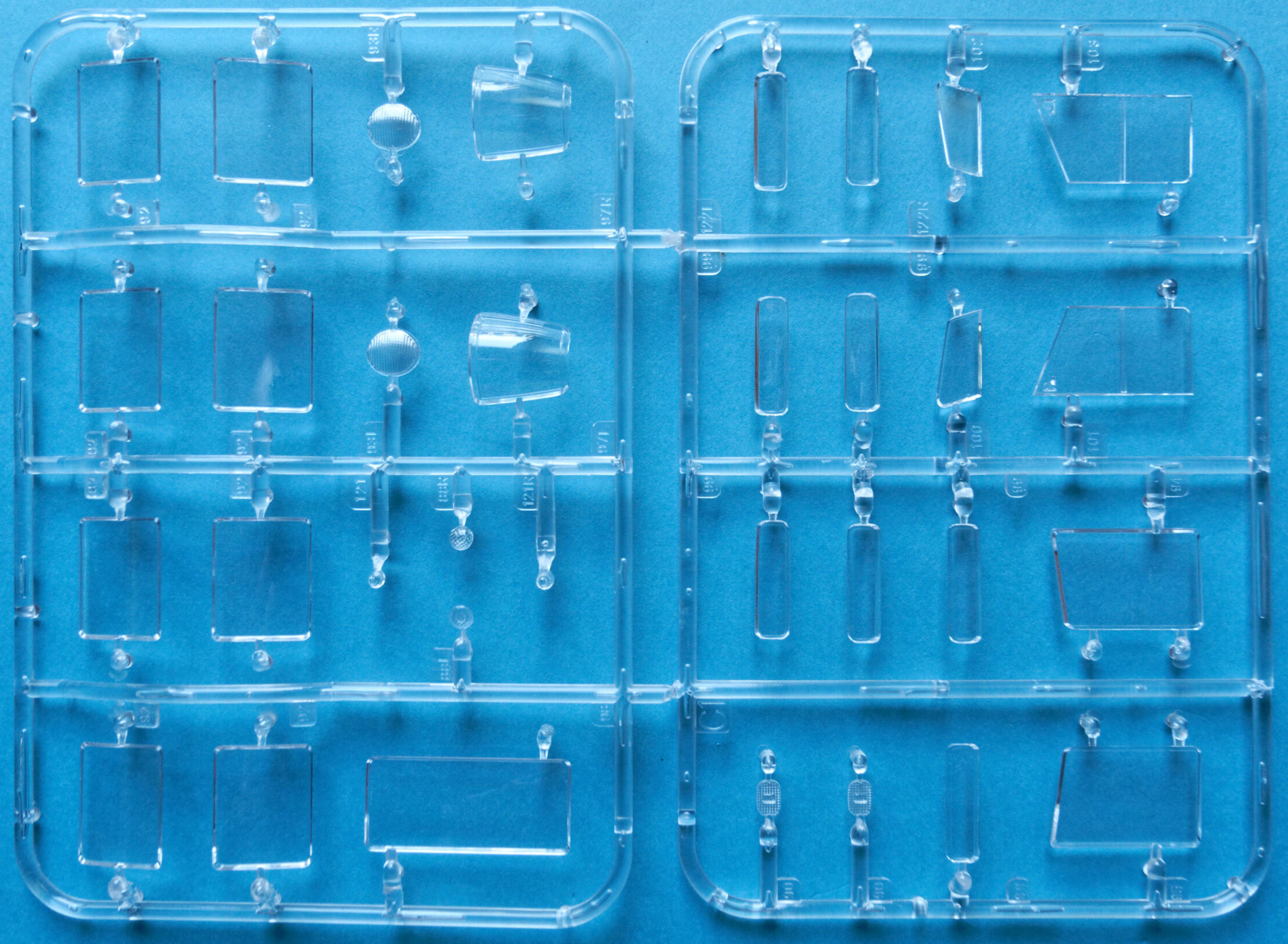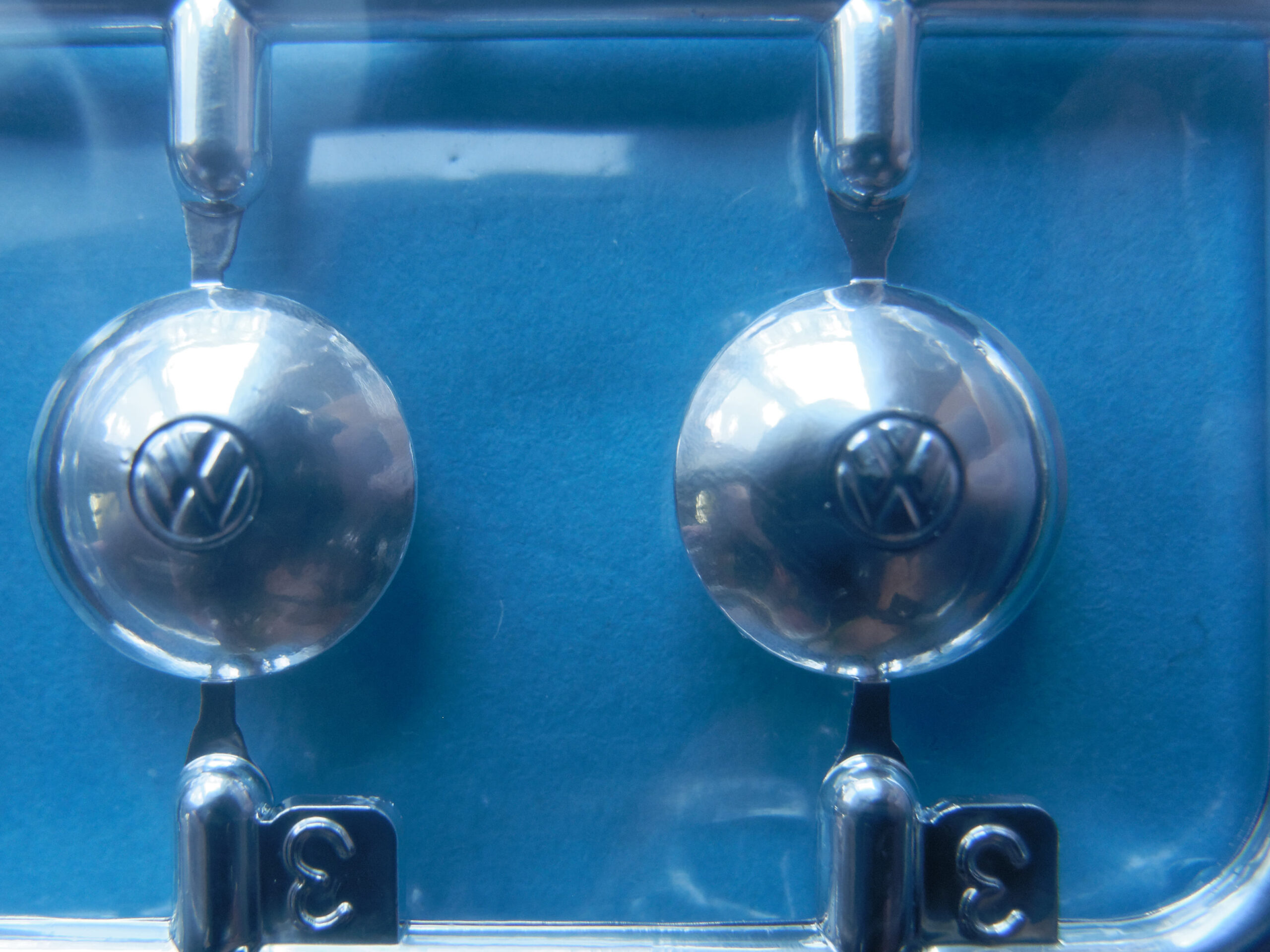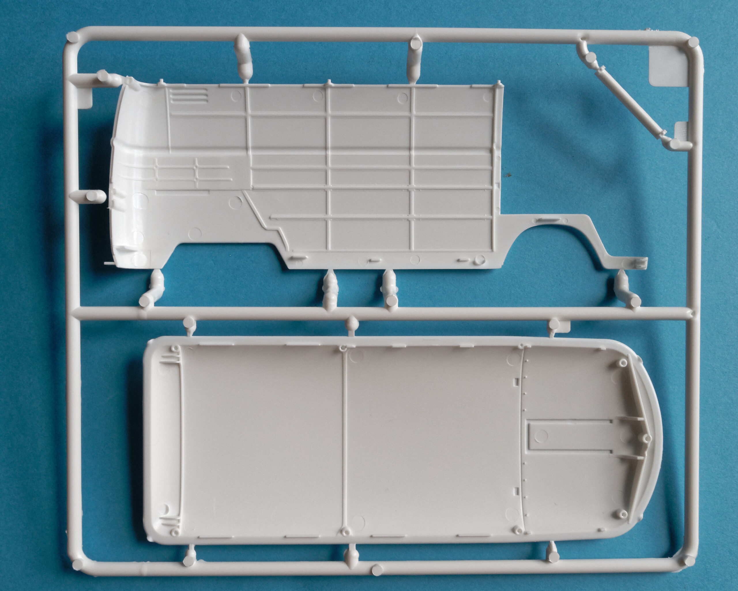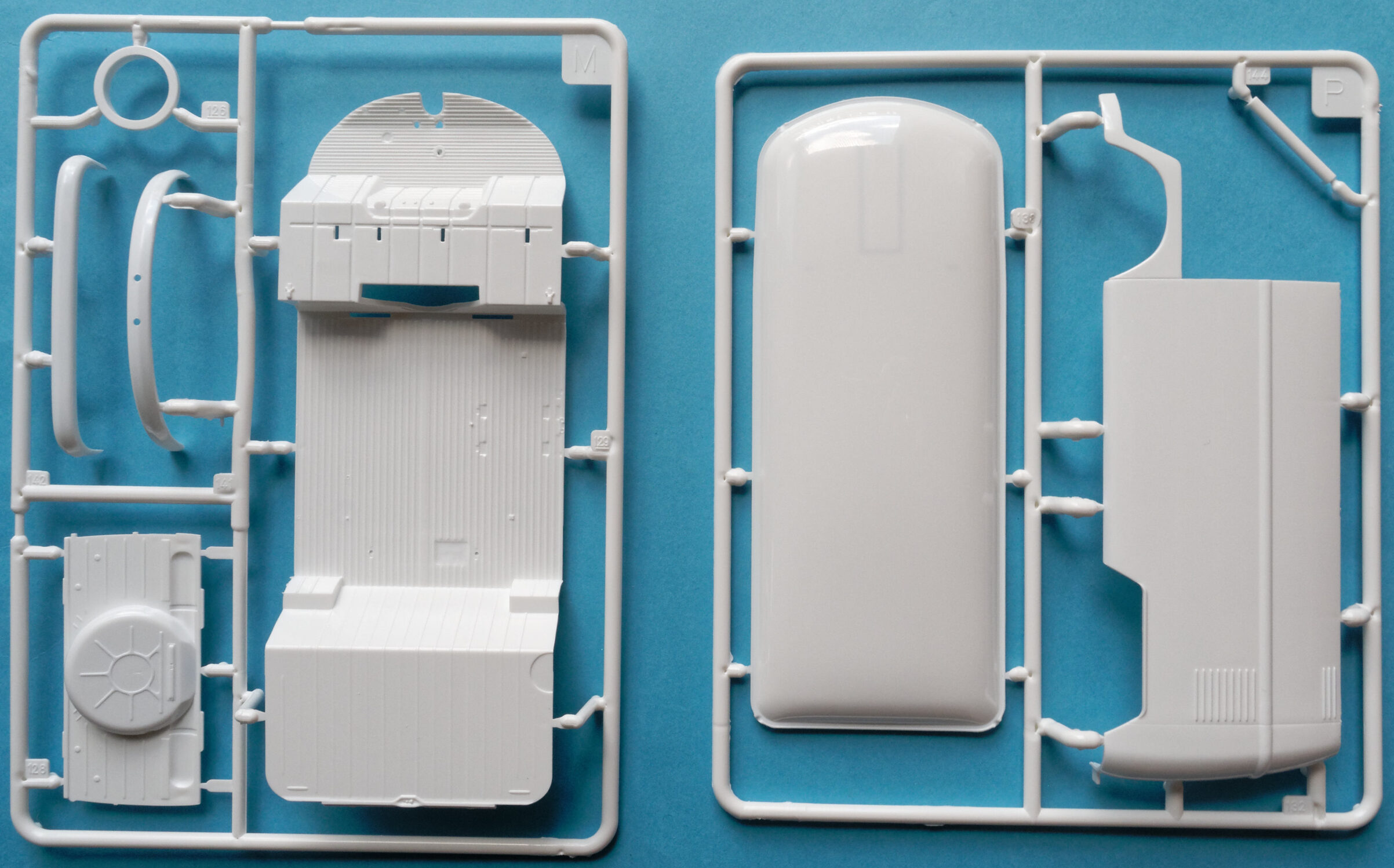Le kit est fourni avec de nombreux détails et fonctionnalités. En plus de l’intérieur complet et de l’espace de chargement, toutes les portes peuvent être ouvertes et le moteur bien mis en œuvre est également présent ici. Au total, 9 pièces moulées doivent être traitées pour l’assemblage. Ceux-ci sont pulvérisés dans du plastique blanc, vaporisé de chrome, gris et argenté. Les 2 grappes transparentes contiennent des disques pour toutes les versions proposées de ce T1 et bien-sûr, toutes ne sont pas nécessaires ici. De plus, il y a 5 roues en vinyle et un arc en plastique flexible transparent.