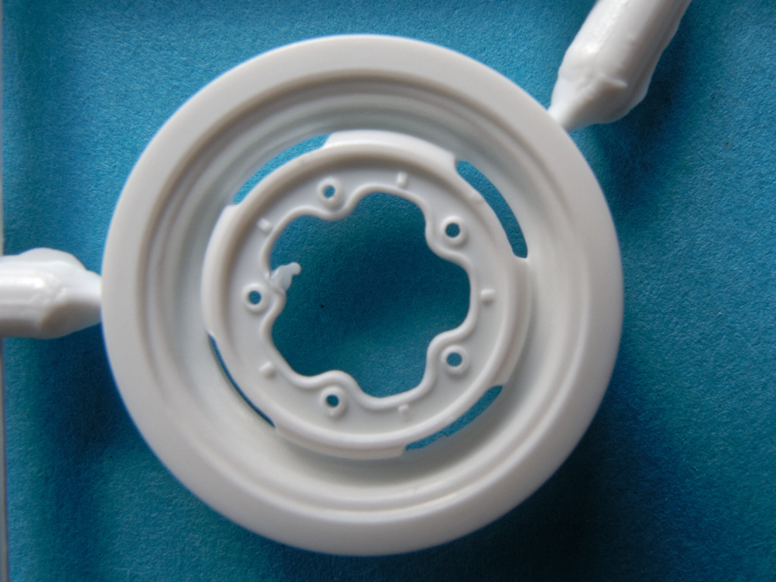La grappe chromée contient toutes les pièces de garniture des phares, des clignotants, des poignées, des enjoliveurs et de nombreuses autres petites pièces bien détaillées. D’ailleurs, j’aime aussi la jante pour la roue de secours, qui a été vraiment très bien mise en œuvre.