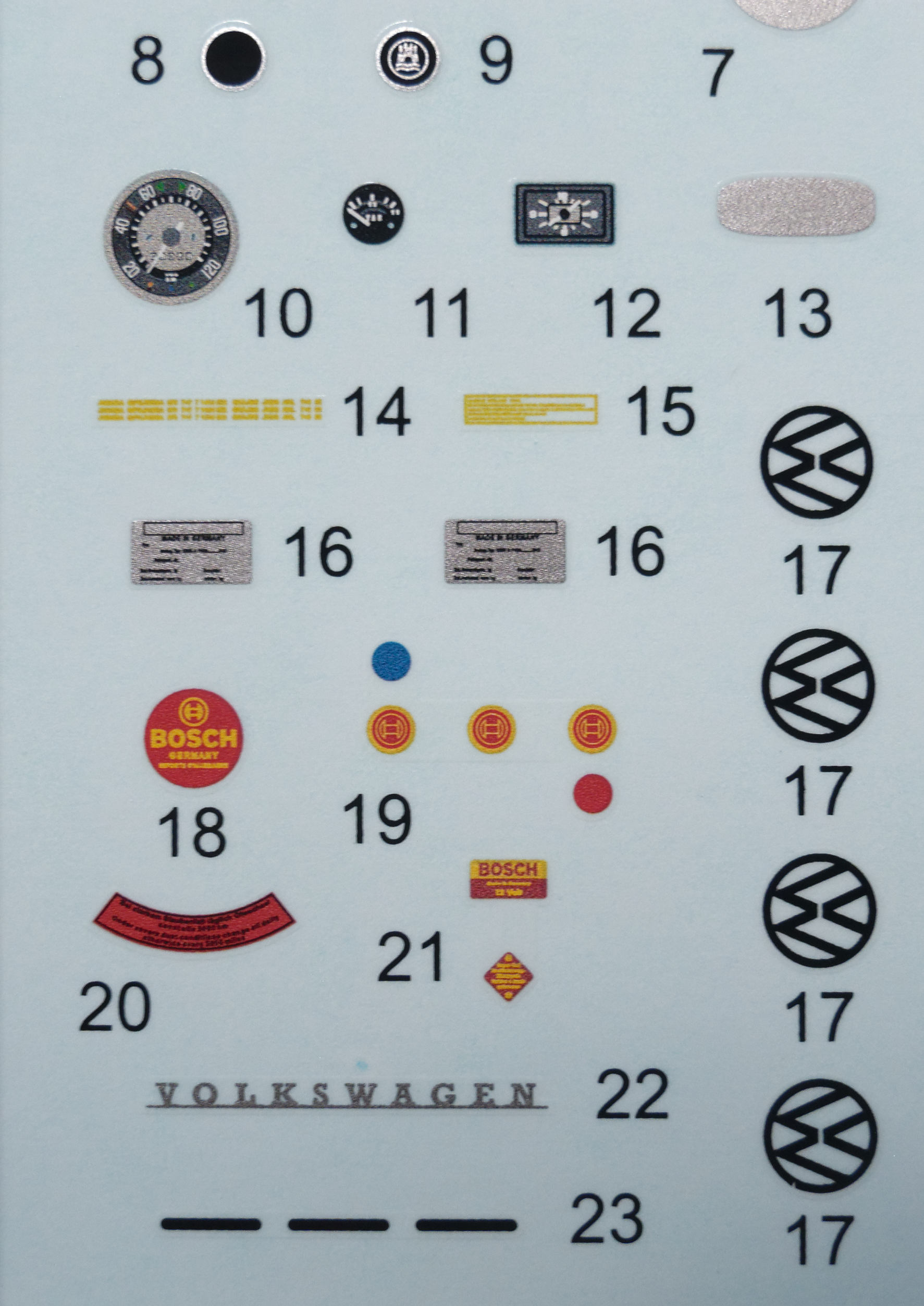 En plus de diverses plaques d’immatriculation, la feuille de décalcomanies contient également de très belles plaques signalétiques aux arêtes vives ainsi que des marquages pour les instruments et les accessoires.