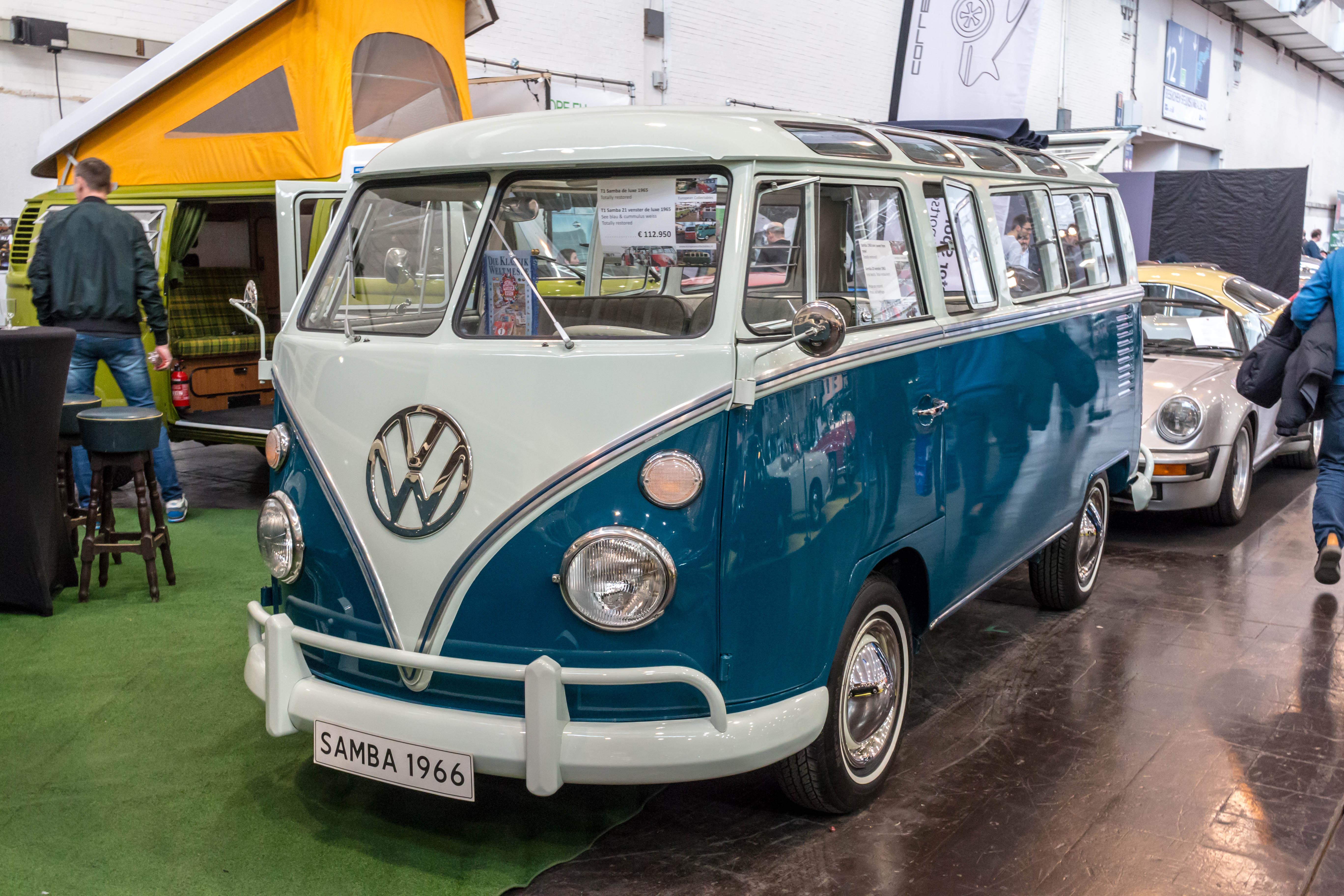 Le modèle spécial à 8 places connu sous le nom de Samba (nom officiel dans la gamme VW) ou Type 24S (plus tard Type 24G, à partir de 1954 Type 241) a été présenté au premier IAA d’après-guerre à Francfort en avril 1951. Il avait des enjoliveurs chromés et un emblème VW poli à l’avant ; jusqu’à la fin de 1951 une peinture tricolore, puis une peinture bicolore ou rarement monochrome. Les différentes zones colorées ont été séparées par des bandes chromées. L’équipement comprenait également un toit ouvrant rabattable au-dessus de l’espace passagers. Contrairement à de nombreuses publications affirmant le contraire, une radio ne faisait pas partie de l’équipement standard du Samba. Contrairement aux autres bus, il y avait une ouverture pour l’installation de la radio dans le tableau de bord spécifique au Samba, mais elle était fermée en usine avec une plaque de recouvrement bicolore élaborée avec un logo VW (l’usine a simplement repris l’emblème du capot avant de la Coccinelle ici). À partir du 10 mars 1953, un pare-chocs arrière a été monté, que les autres variantes du T1 n’ont reçu que le 21 décembre 1954.