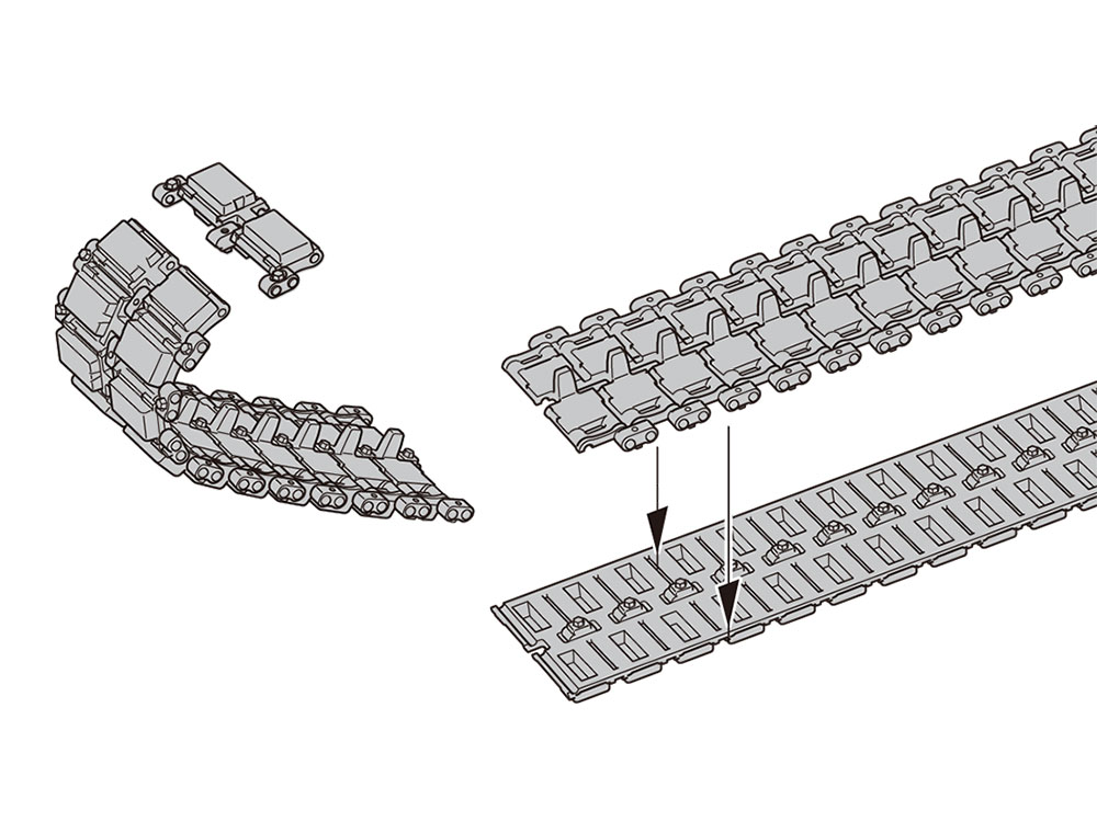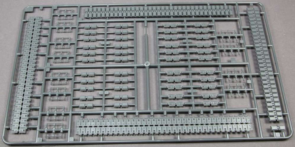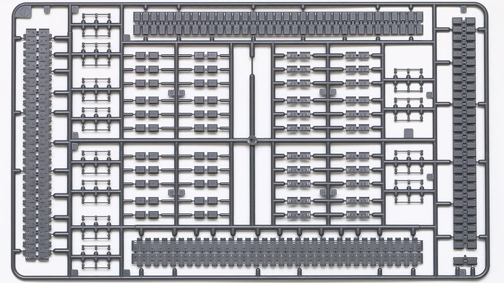 Cette grappe est de couleur grise et disponible 2 fois. Sur celle-ci se trouvent les composants de la chenille du kit Leopard 2A7V. Ici, Tamiya s'est aventuré en avant et a développé une combinaison de liens et de segments individuels. Les segments les plus grands sont chacun conçus en 2 parties. Les maillons individuels comportent également une partie supérieure et inférieure ainsi qu'une barre de connexion. Voici le montage :