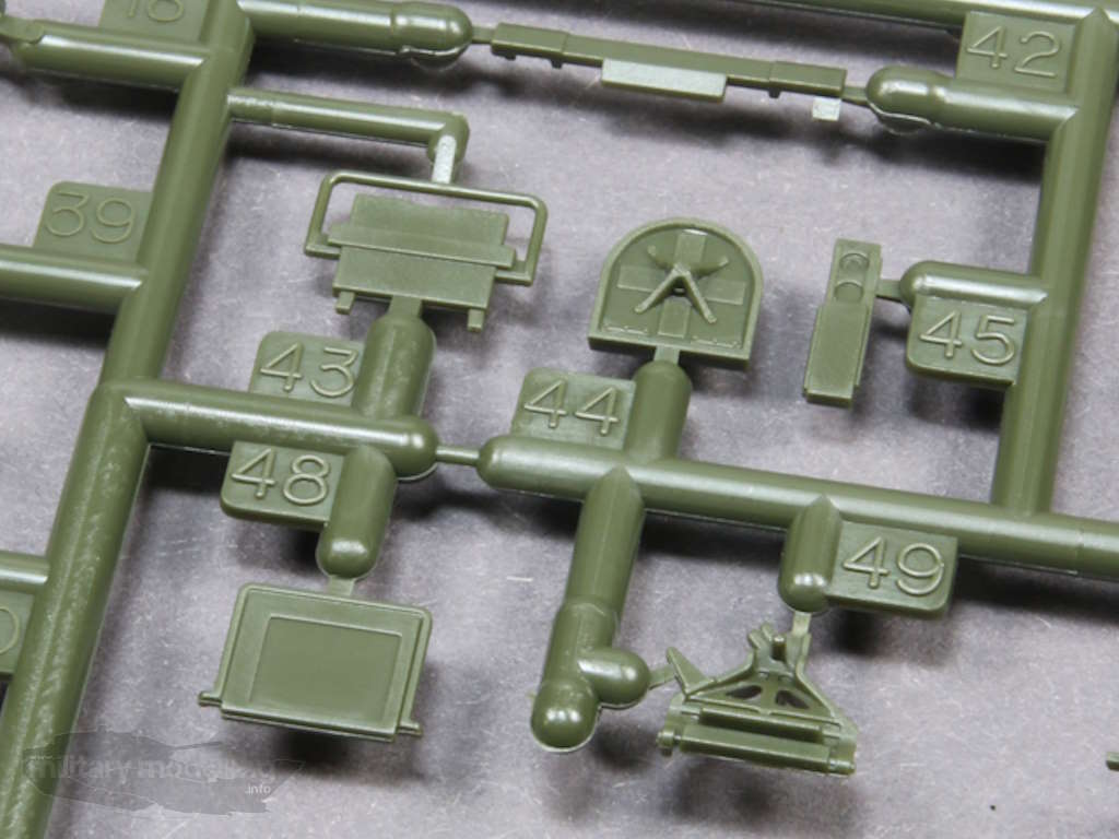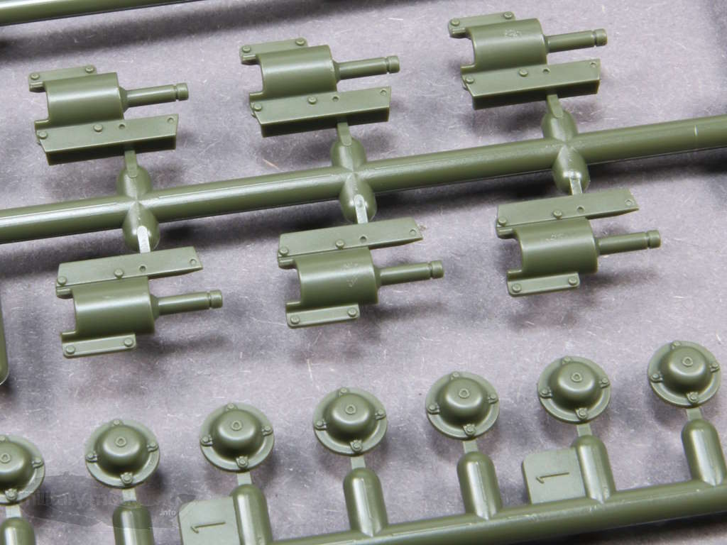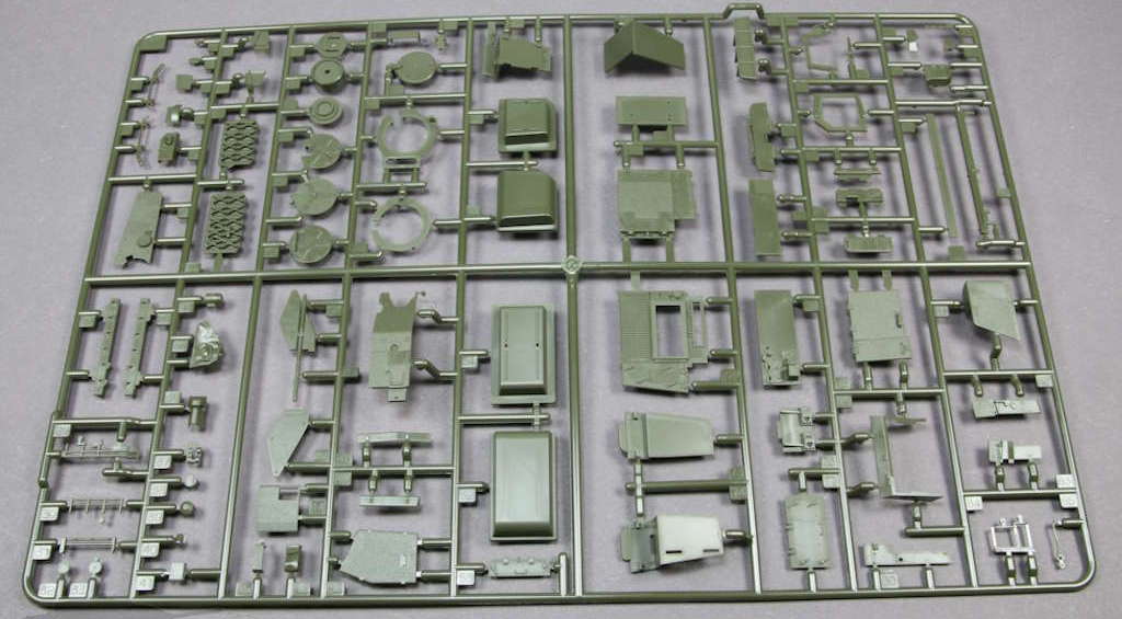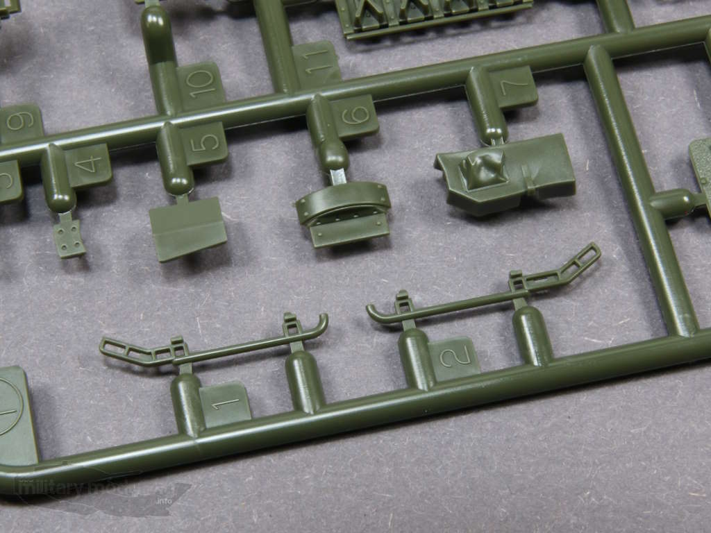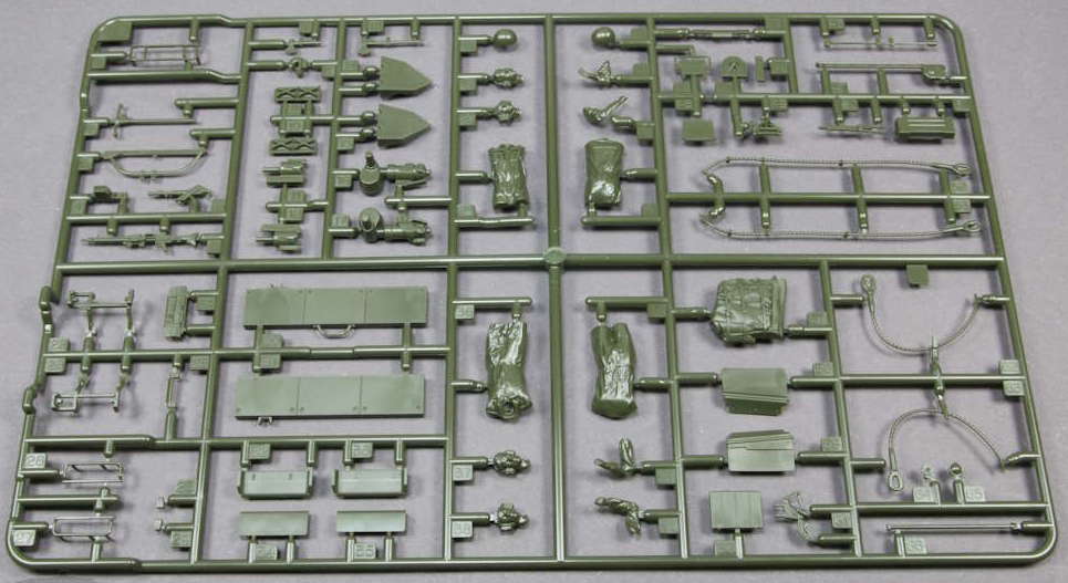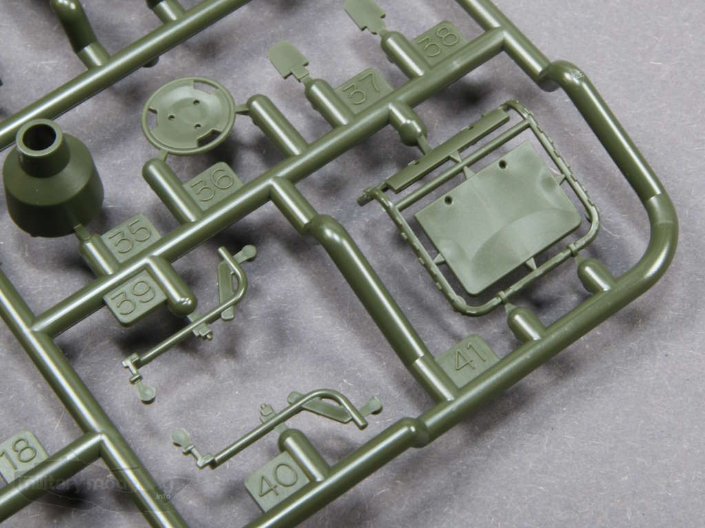 Mais depuis le début, le kit comprend 6 grappes vert olive, 2 grises et une transparente. Examinons de plus près les détails des composants des pièces moulées, en commençant par la grappe moulée A.