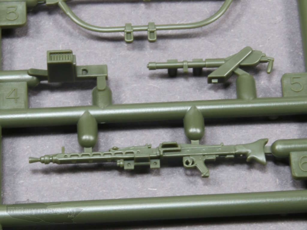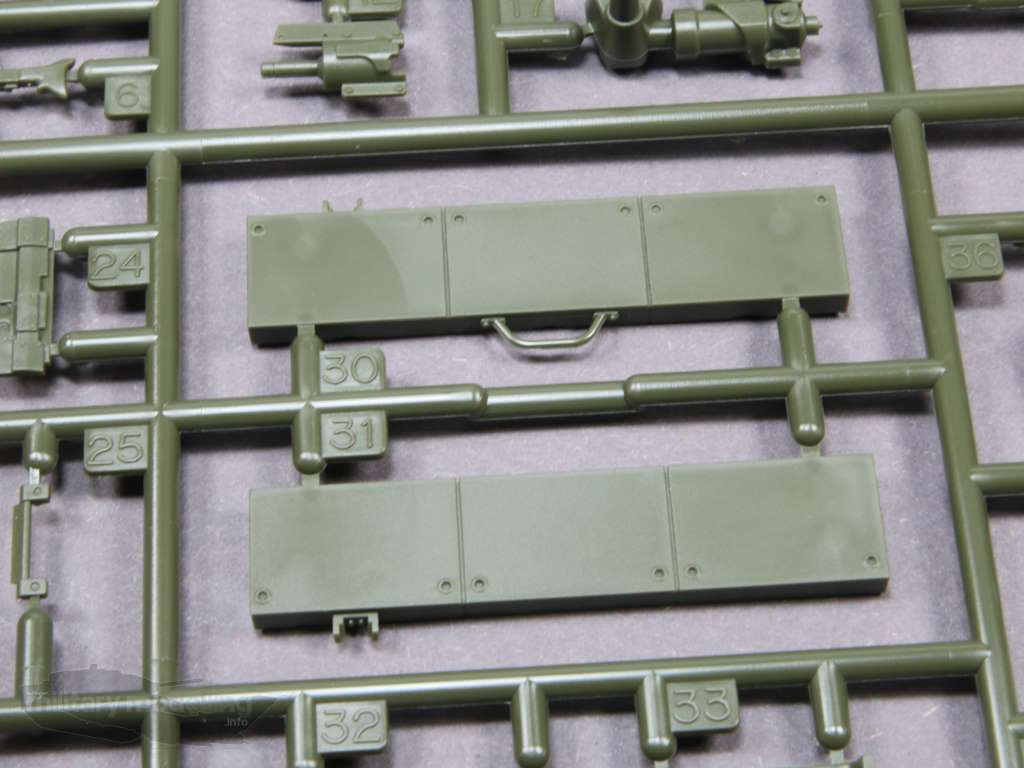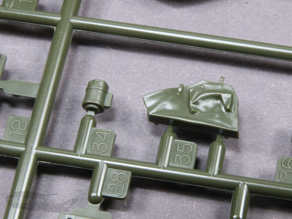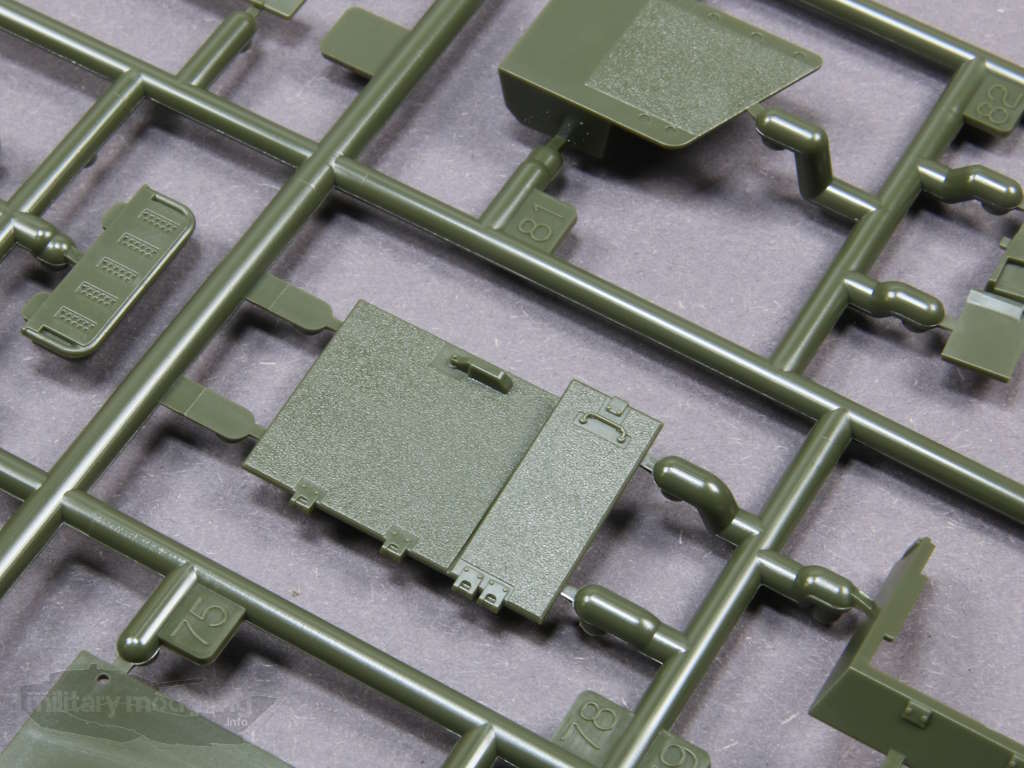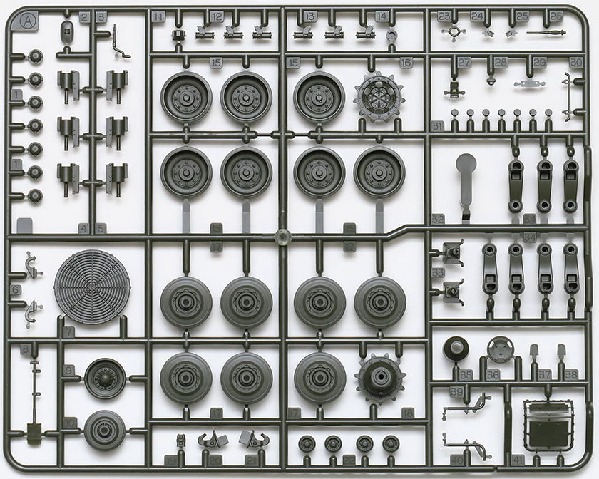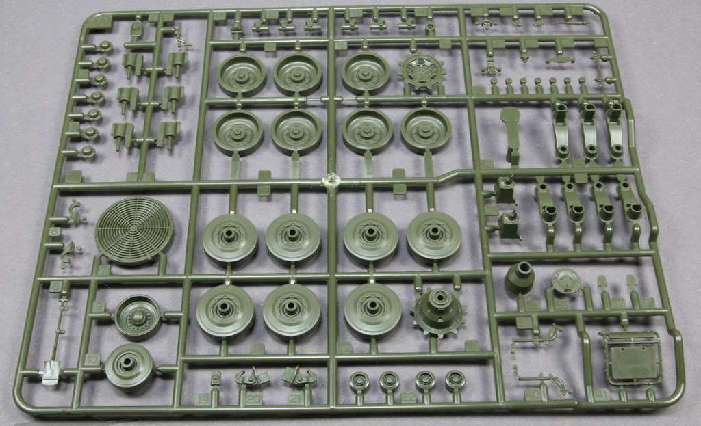 Mais depuis le début, le kit comprend 6 grappes vert olive, 2 grises et une transparente. Examinons de plus près les détails des composants des pièces moulées, en commençant par la grappe moulée A.