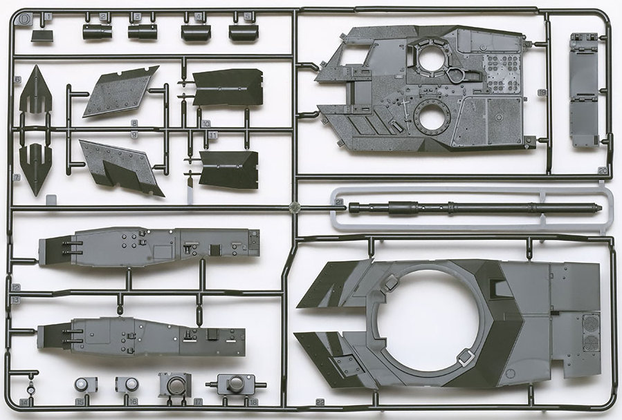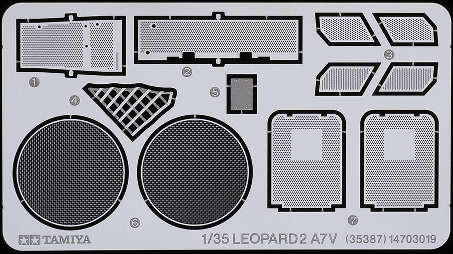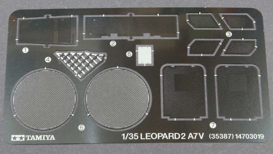 Tamiya a créé un kit de haute qualité avec son kit Leopard 2A7V. Le kit est livré avec de nombreux composants magnifiquement détaillés, répartis en 10 grappes moulées. La combinaison avec des pièces transparentes, des pièces gravées et l'utilisation de polycaps sont bien pensées. Cependant, les concurrents peuvent mieux faire certains détails. L'amateur d'équipement militaire moderne en aura toujours pour son argent avec ce kit.