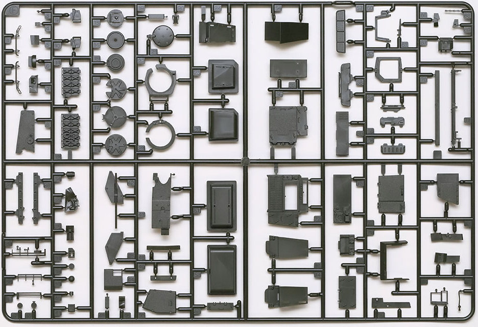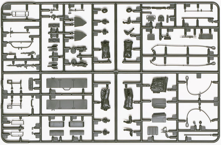 Ce qui n'est pas du tout courant chez Tamiya, le kit comprend une planche de pièces photodécoupées. Sur la planche photodécoupée se trouvent des grilles finement gravées pour les paniers de rangement arrière et latéraux ainsi que les ventilateurs annulaires sur le pont moteur. La planche elle-même est très fine !