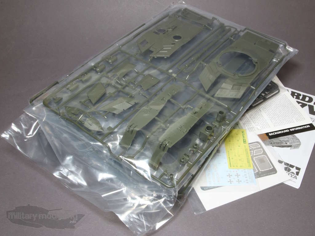 Le kit de char de combat principal allemand Leopard 2A7V portant le numéro d'article 35387 de Tamiya est livré dans une boîte robuste et finement conçue. Si vous ouvrez la boîte, vous trouverez les pièces moulées en polystyrène vert olive, gris et transparent, soigneusement enveloppées dans un film plastique. Il y a aussi des instructions de montage, une planche de photo-découpe et des décalcomanies.