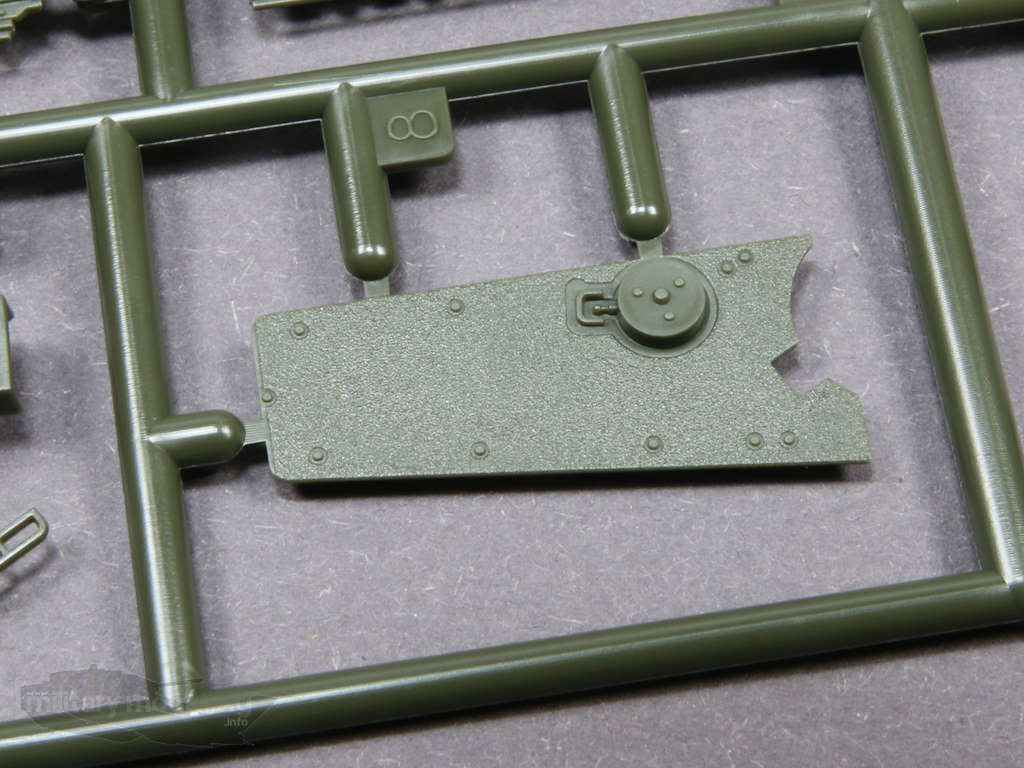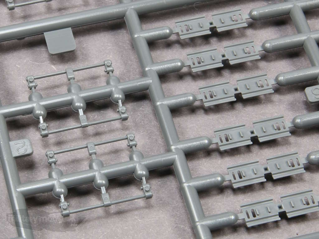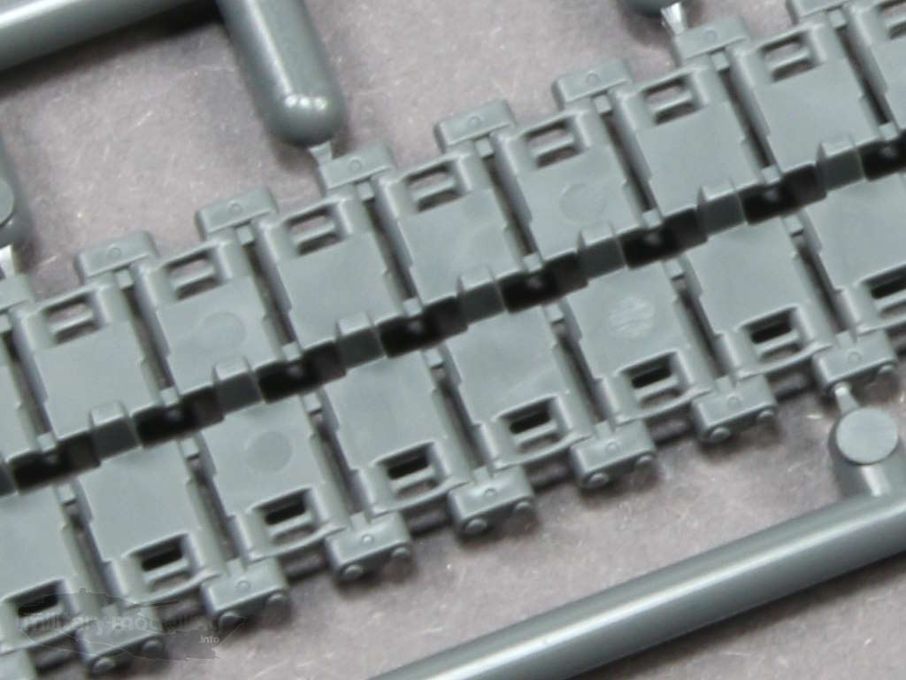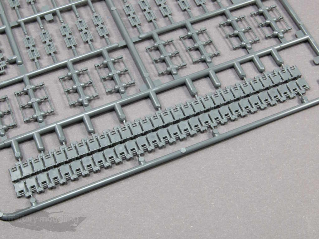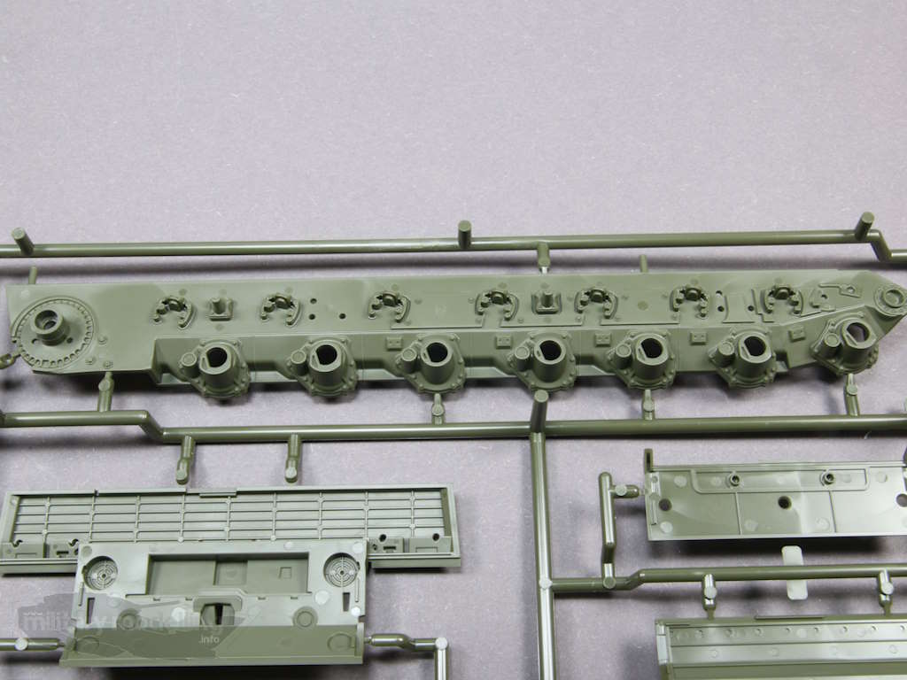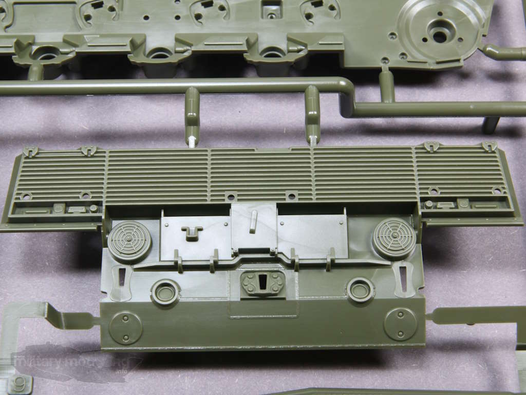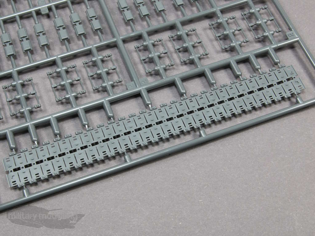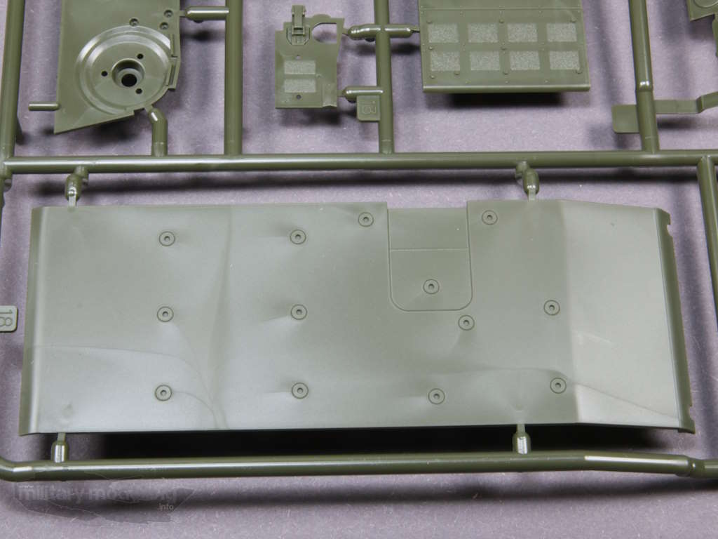 Une fois toutes les pièces assemblées, la section arrière présente toutes les caractéristiques correctes et importantes, y compris les feux arrière plus hauts dans les grilles, ainsi que les supports de maillons de chaîne de remplacement au-dessus des grilles d'échappement. La partie avant du char, incluant le blindage renforcé, est fournie sur cette grappe.