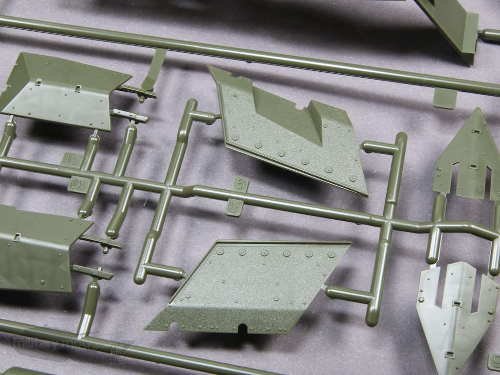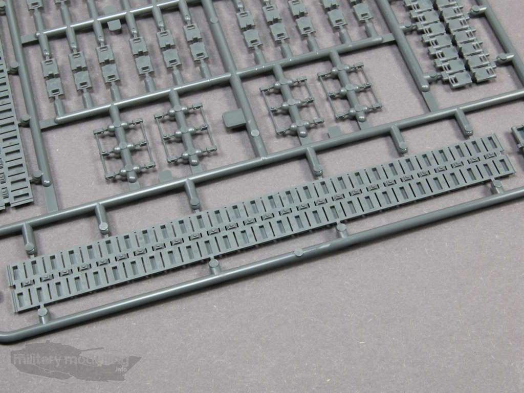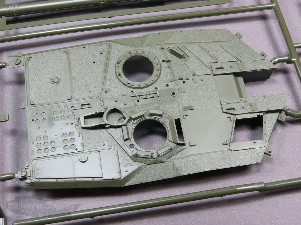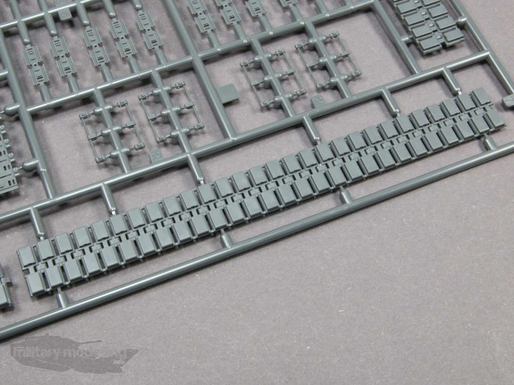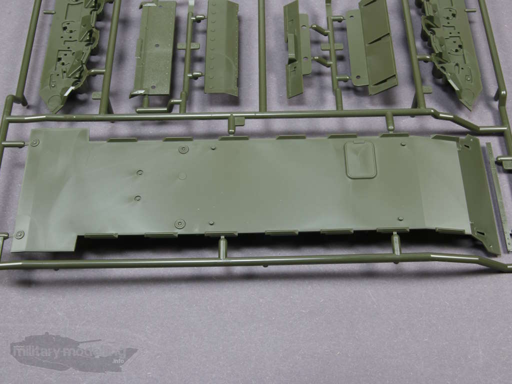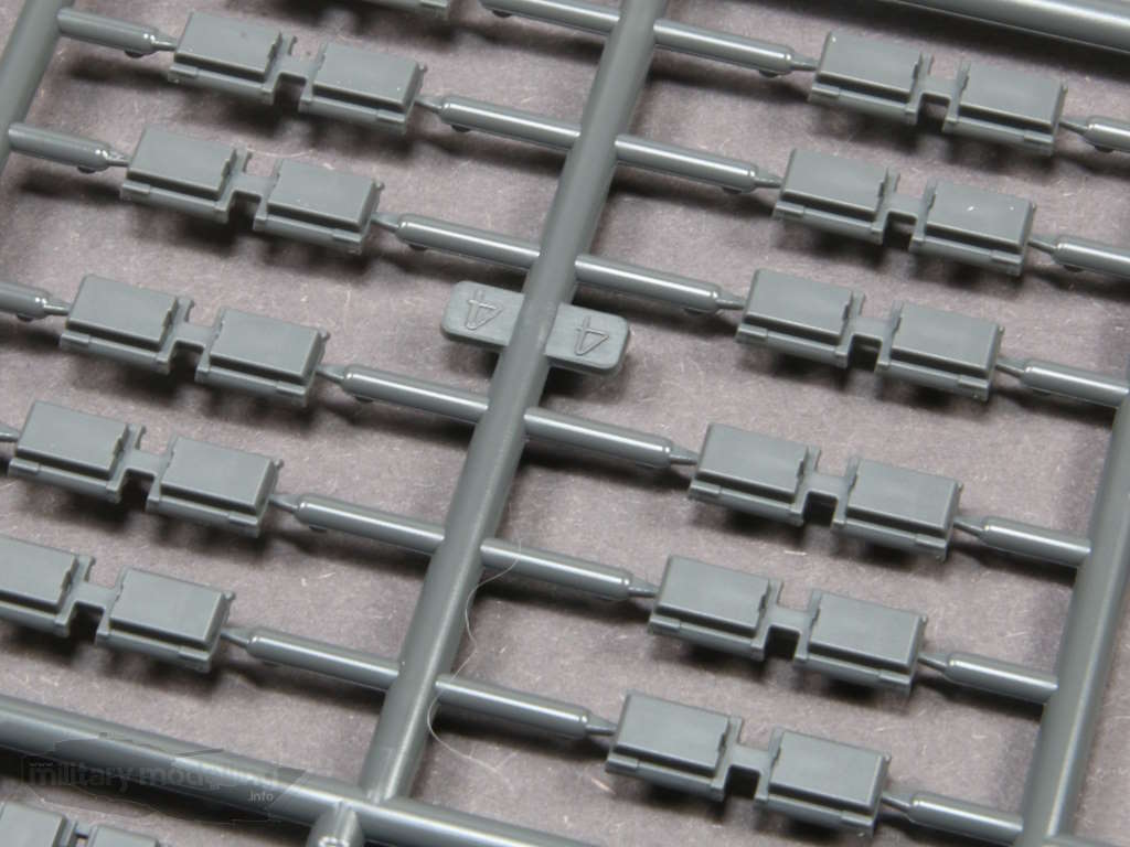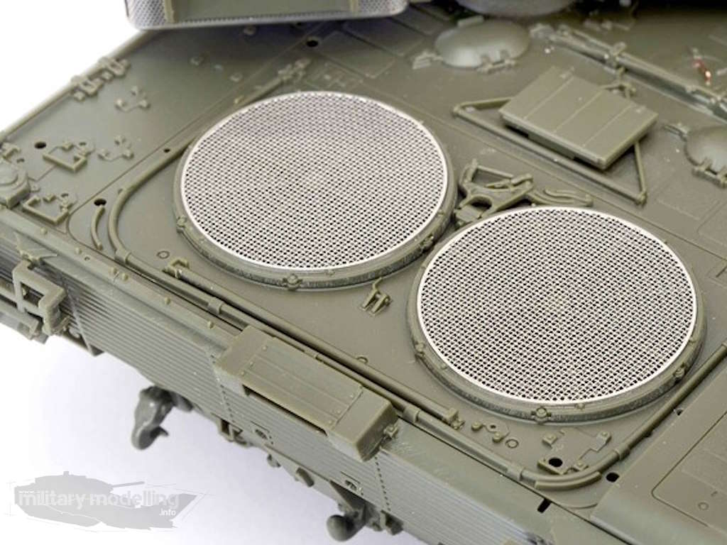 Une fois toutes les pièces assemblées, la section arrière présente toutes les caractéristiques correctes et importantes, y compris les feux arrière plus hauts dans les grilles, ainsi que les supports de maillons de chaîne de remplacement au-dessus des grilles d'échappement. La partie avant du char, incluant le blindage renforcé, est fournie sur cette grappe.