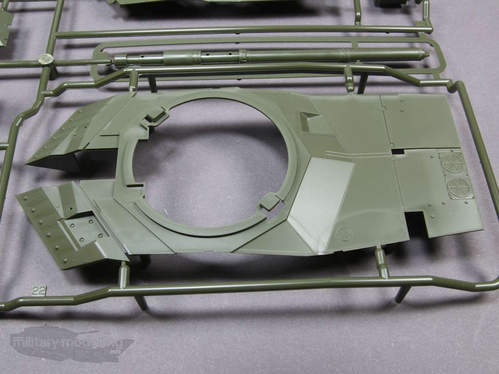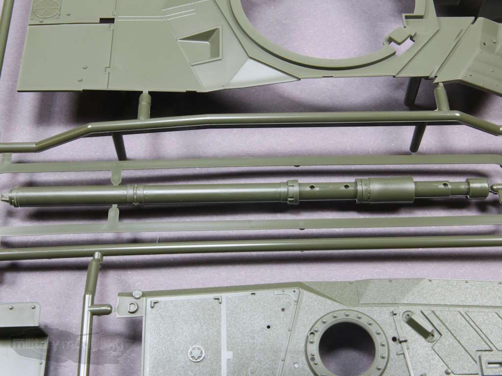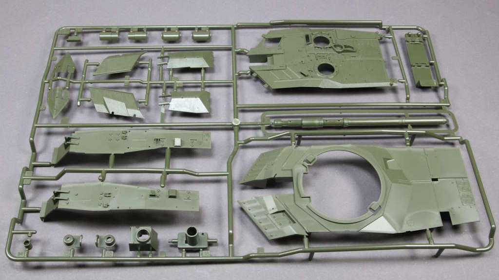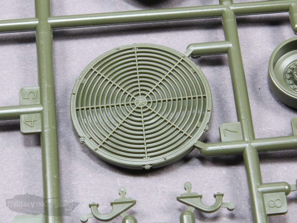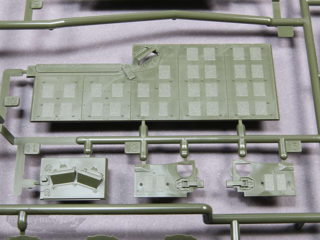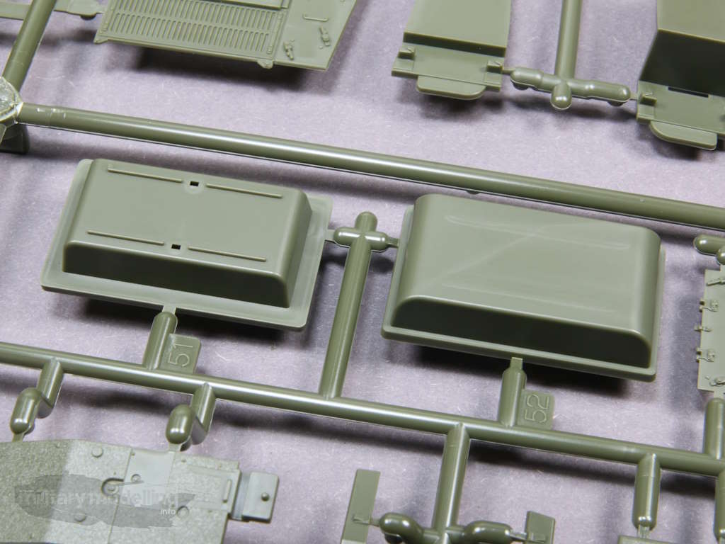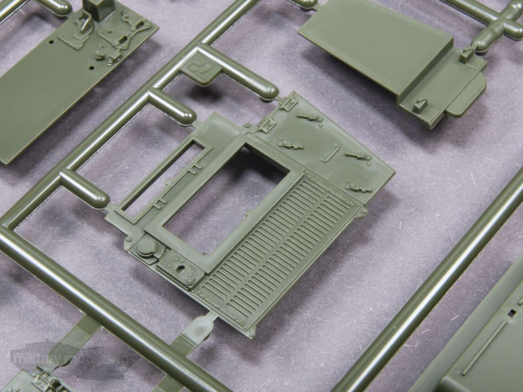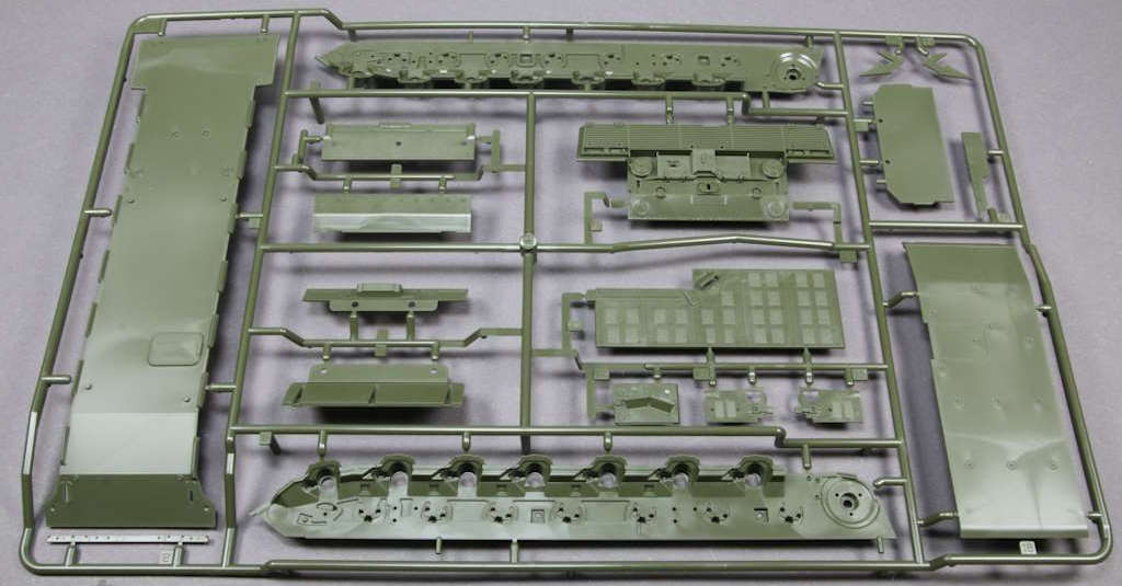Une fois toutes les pièces assemblées, la section arrière présente toutes les caractéristiques correctes et importantes, y compris les feux arrière plus hauts dans les grilles, ainsi que les supports de maillons de chaîne de remplacement au-dessus des grilles d'échappement. La partie avant du char, incluant le blindage renforcé, est fournie sur cette grappe.
