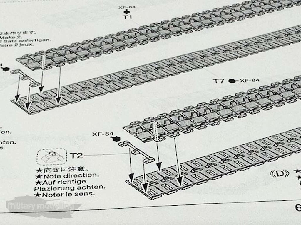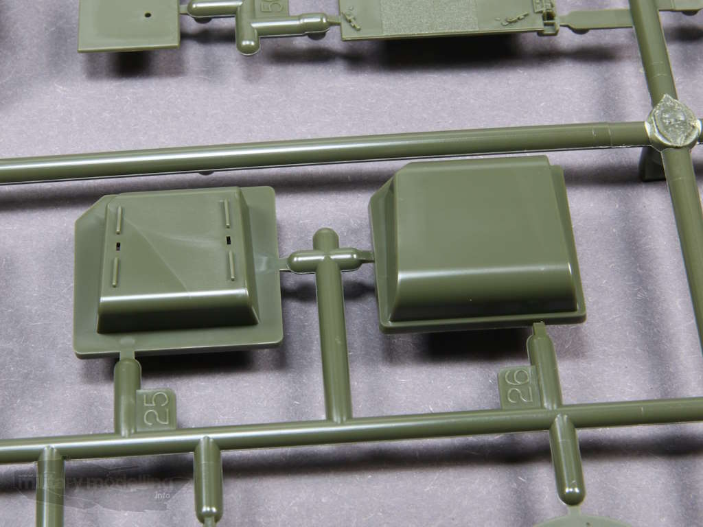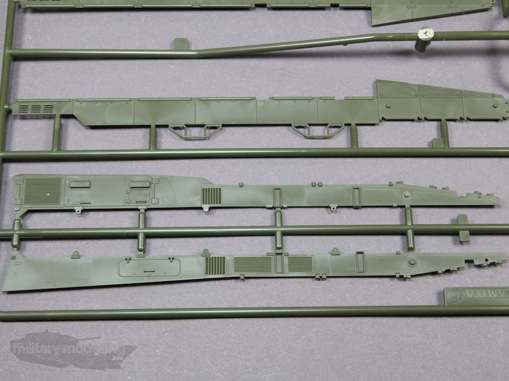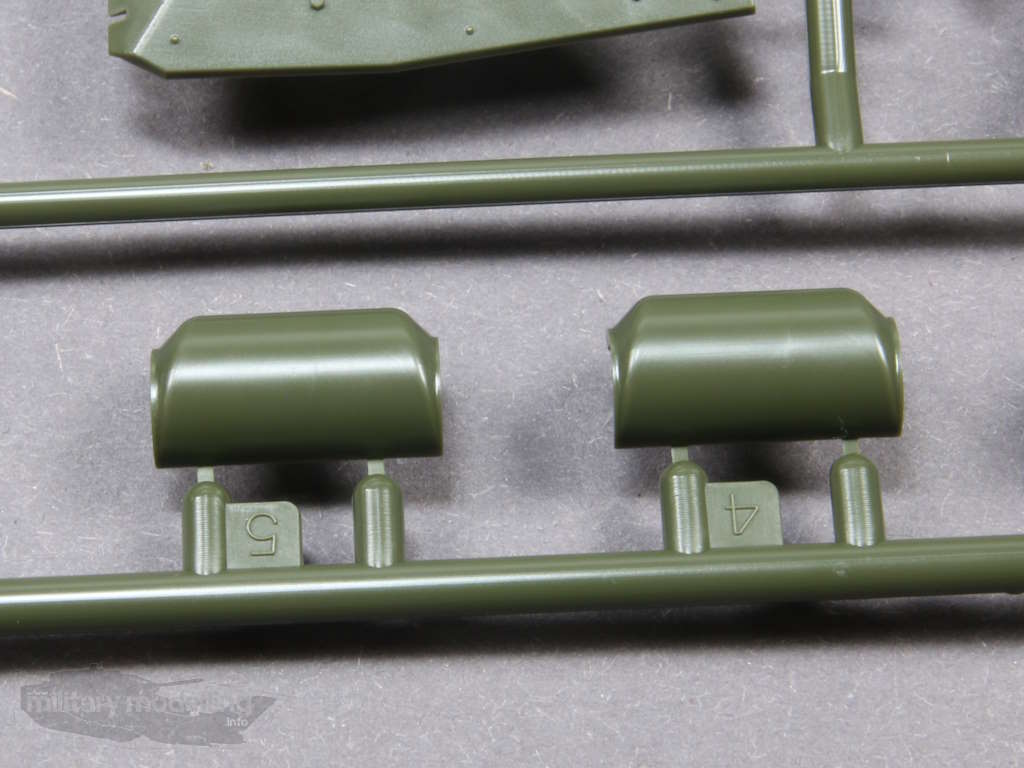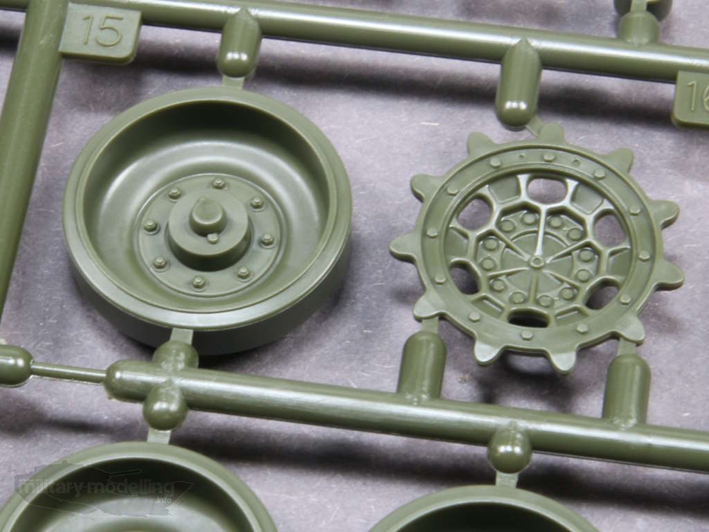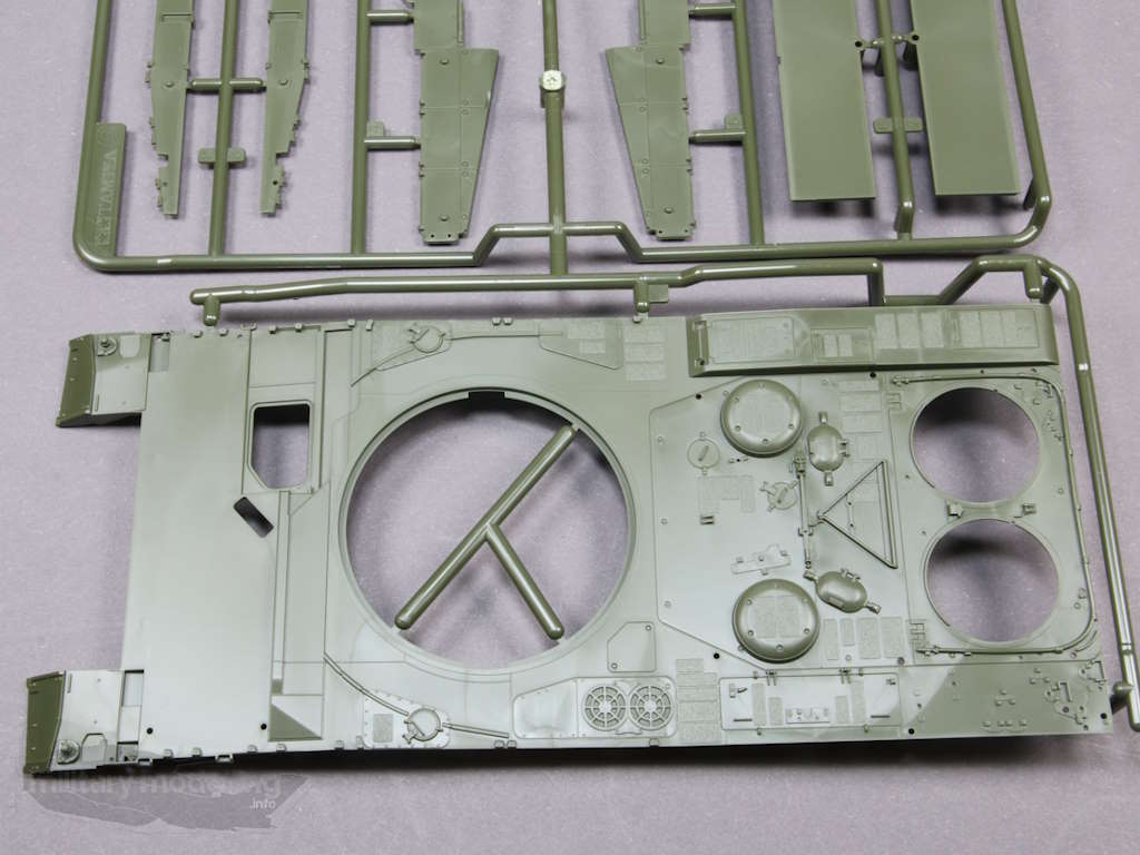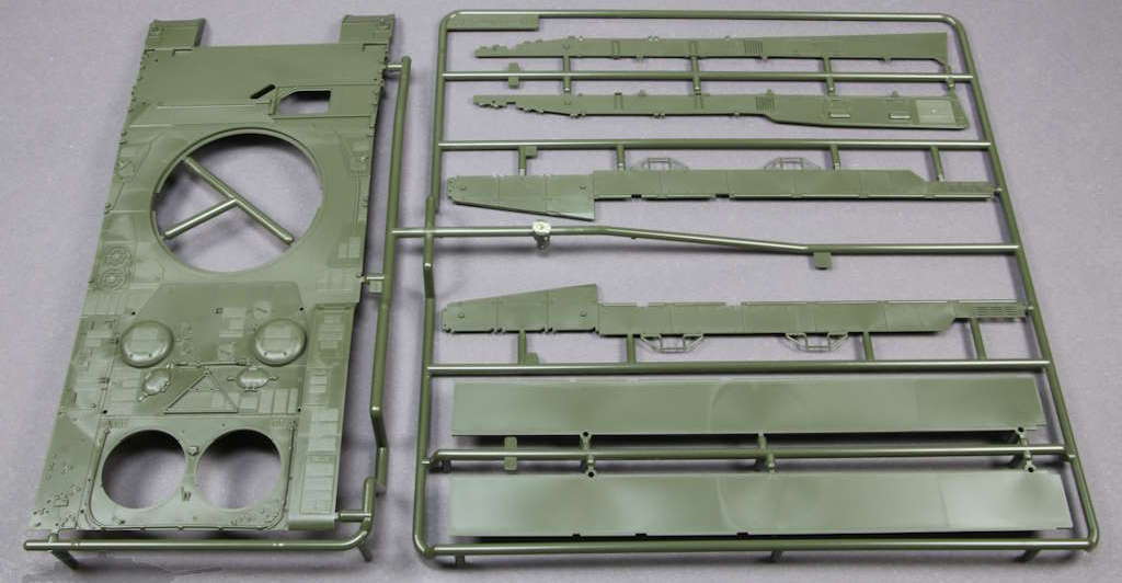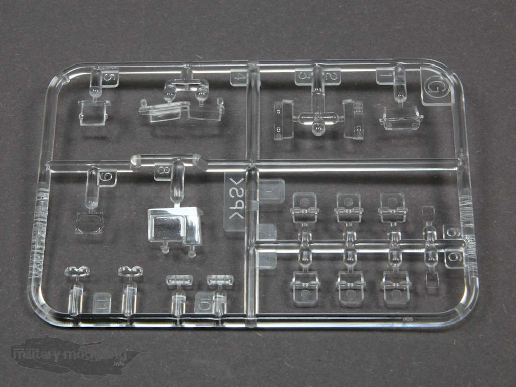 Une fois toutes les pièces assemblées, la section arrière présente toutes les caractéristiques correctes et importantes, y compris les feux arrière plus hauts dans les grilles, ainsi que les supports de maillons de chaîne de remplacement au-dessus des grilles d'échappement. La partie avant du char, incluant le blindage renforcé, est fournie sur cette grappe.
