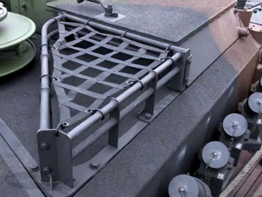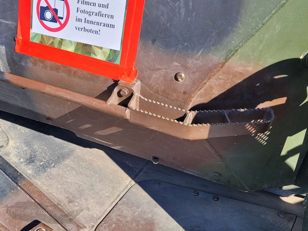 Il faut mentionner ici que Tamiya a correctement montré les grilles des paniers de rangement latéraux sur la tourelle. Les grilles ne sont pas continues dans l'original. Mais ce qui manque, ce sont les petites chaînes pour les conteneurs du système de lancement multiple.