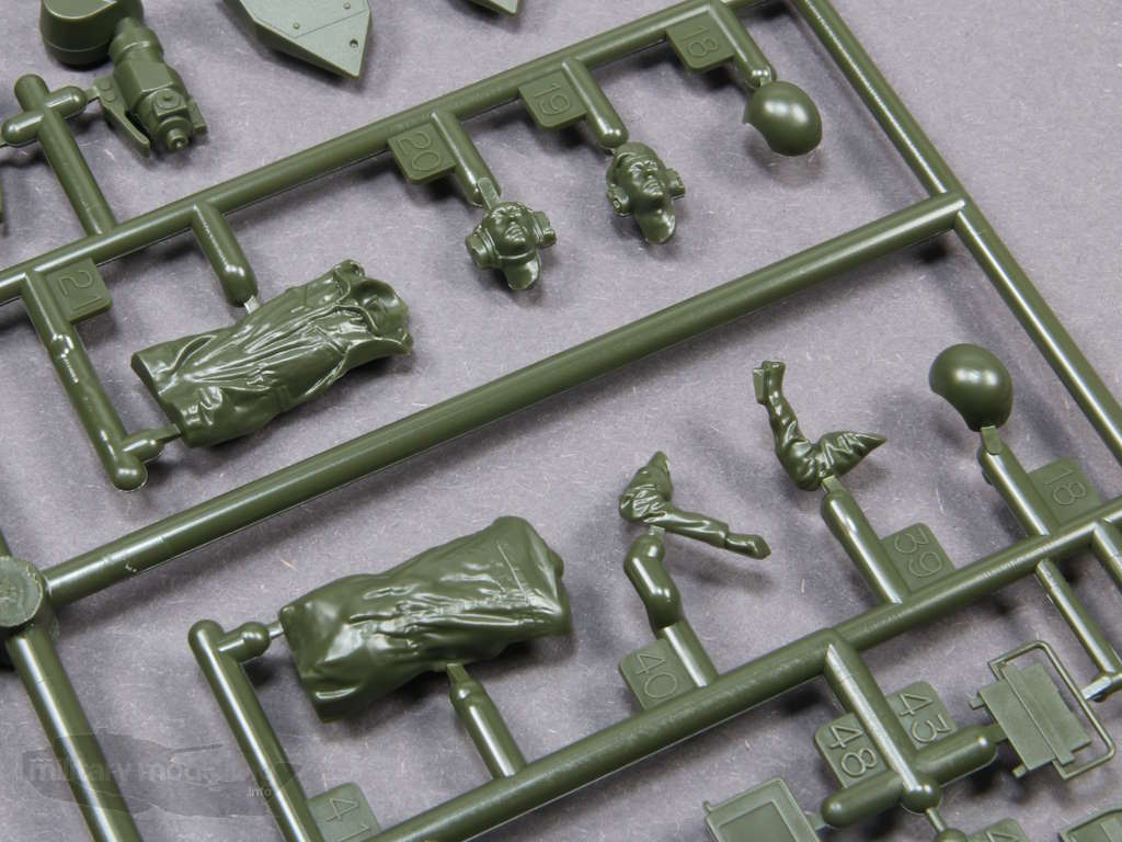 Ce qui mérite particulièrement d'être mentionné, c'est que Tamiya inclut 2 figurines de torse pour l'équipage sur ce modèle moulé ! Conçues en plusieurs parties, elles sont vraiment belles et offrent la possibilité de choisir entre 2 têtes différentes : béret ou cagoule de protection.