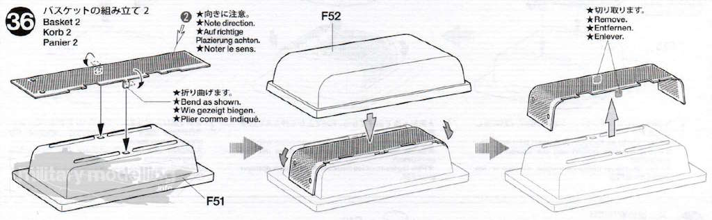 C'est une très bonne idée de Tamiya et évite les tracas liés au pliage. Les pièces photodécoupées sont serrées dans les parties supérieure et inférieure puis pressées. Les instructions se trouvent à l'étape de construction 36. Le composant correctement courbé est terminé !