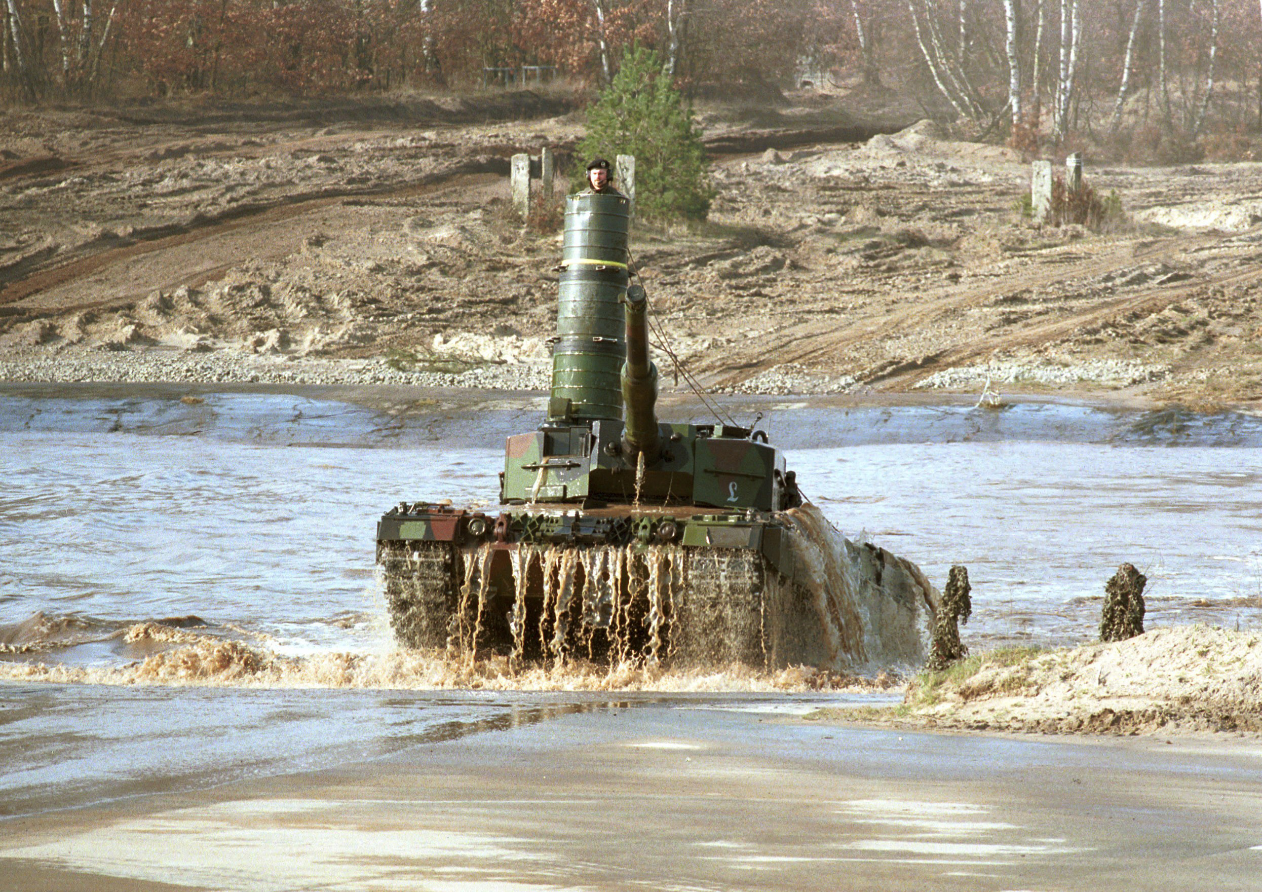 Le Leopard 2 peut traverser l’eau à 4 mètres (13 pieds) de profondeur à l’aide d’un snorkel ou à 1,2 mètre (3 pieds 11 pouces) sans aucune préparation. Il peut escalader des obstacles verticaux de plus d’un mètre de haut.
