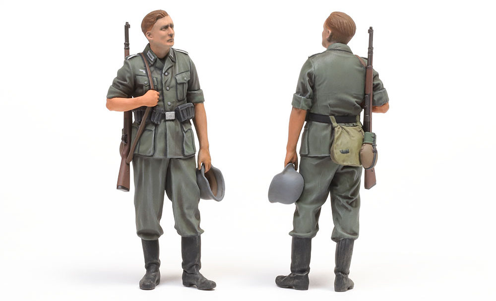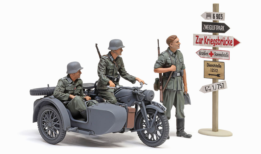 3 soldats de la Wehrmacht sont fournis. L’un est le pilote, le second est un passager et le dernier personnage passe et regarde un panneau de signalisation.
