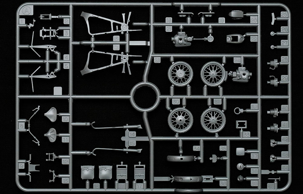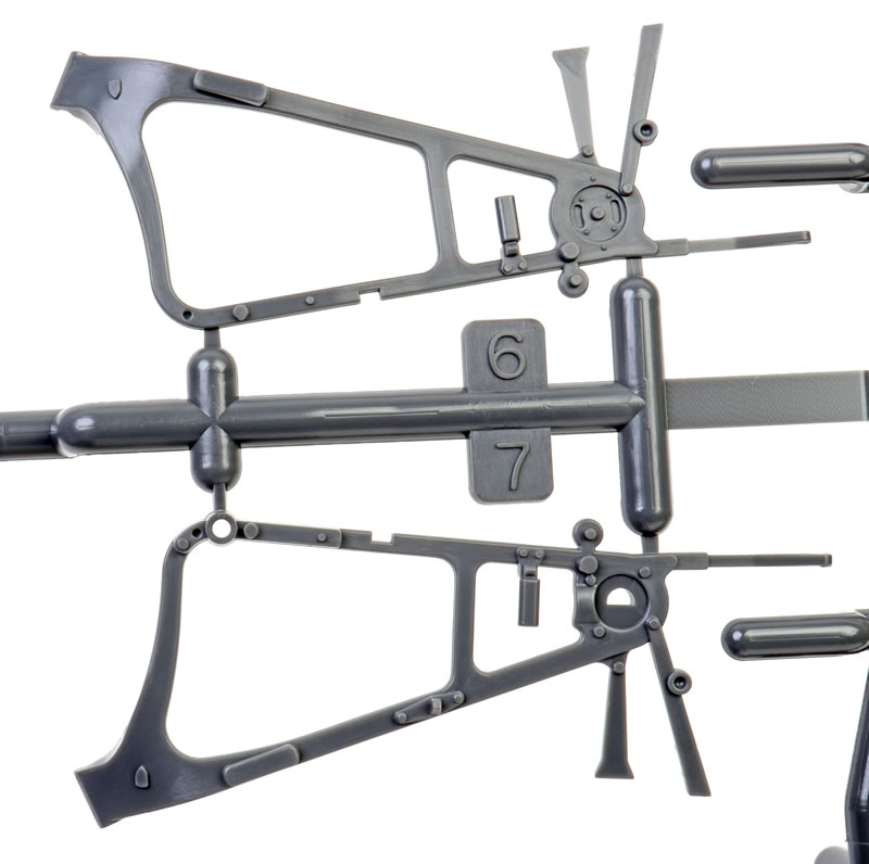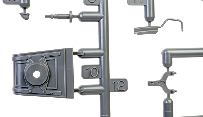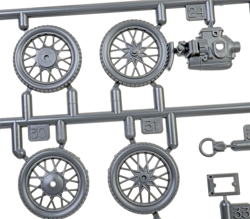 Le set comprend 65 pièces gris foncé sur 2 grappes couvrant l'assemblage de la moto et de la side-car, et 34 autres pièces en plastique de couleur gris moyen avec 3 figures et accessoires connexes. Les marques pour 5 plaques d'immatriculatin plus le cadran de l'instrument sont incluses sur la petite feuille de décalcomanies.