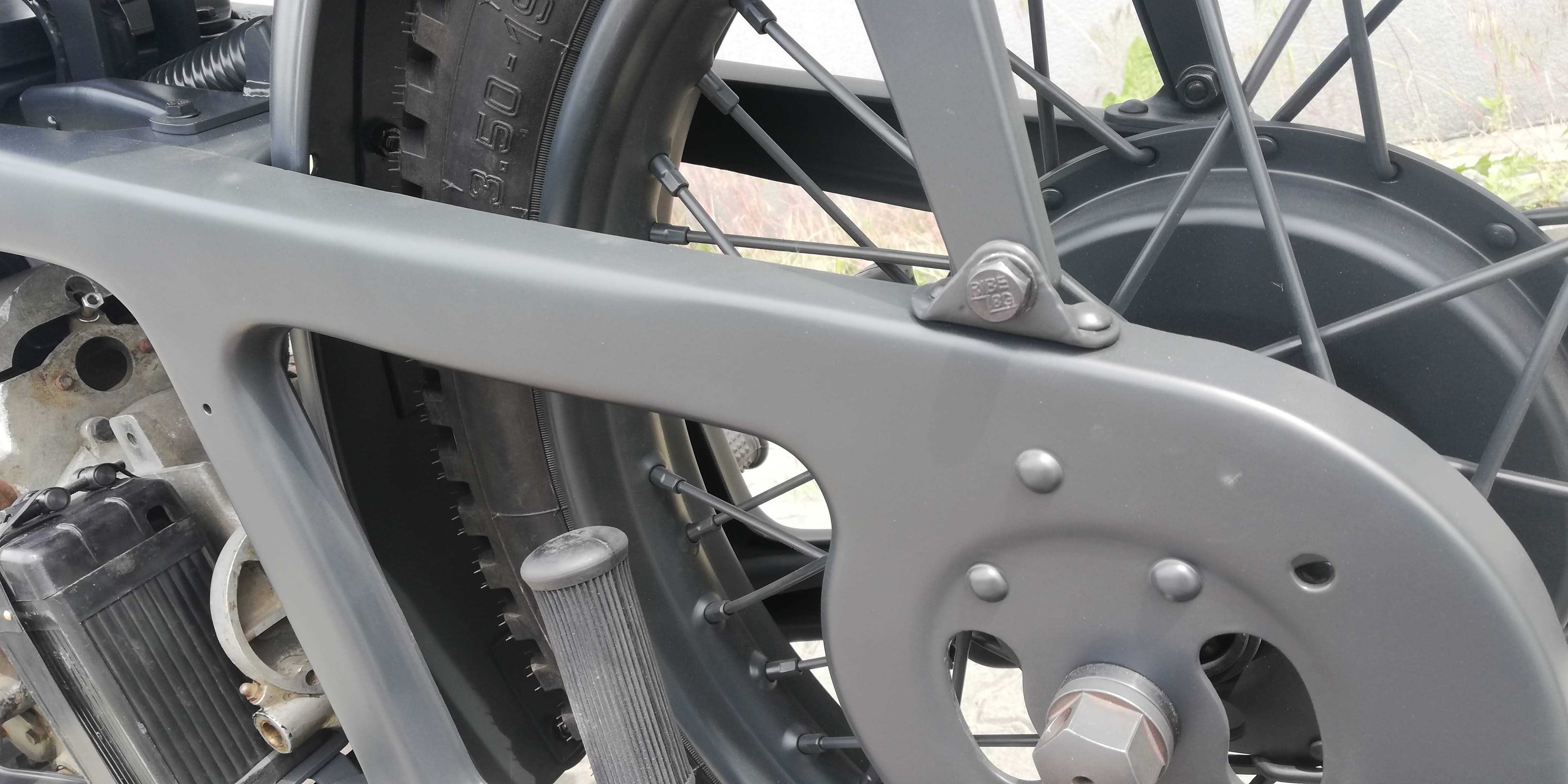 La roue avant est fixée au garde-boue et aux fourches avant. L’équilibre de l’assemblage de la moto semble être très simple.