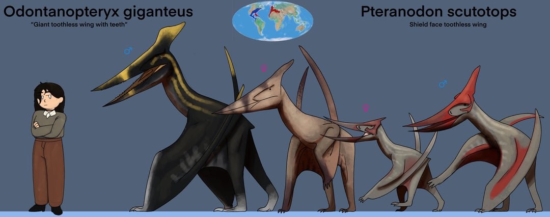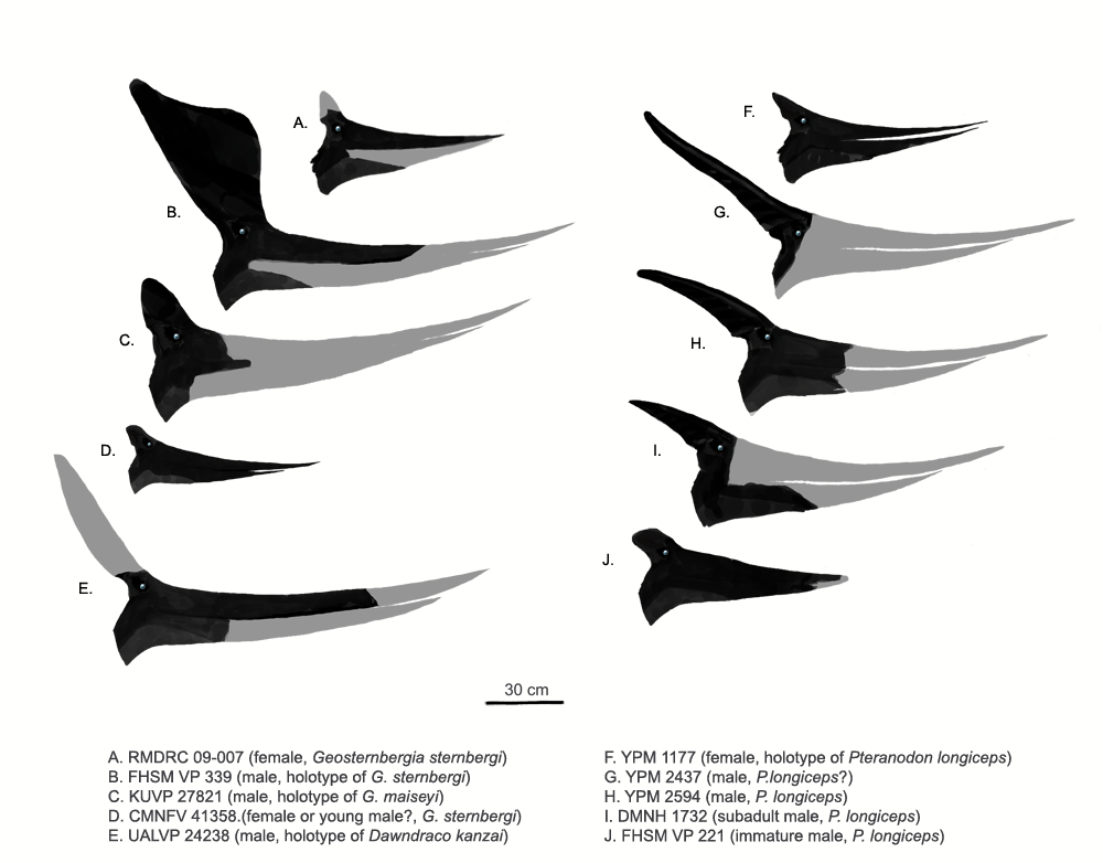 Les spécimens adultes de Ptéranodon peuvent être divisés en 2 classes de taille distinctes, petite et grande, la grande classe étant environ une fois et demie plus grande que la petite classe, et la petite classe étant 2 fois plus commune que la grande classe. Les 2 classes de taille vivaient côte à côte, et bien que les chercheurs aient précédemment suggéré qu’elles représentaient des espèces différentes, Christopher Bennett a montré que les différences entre elles sont cohérentes avec le concept selon lequel elles représentent des femelles et des mâles, et que les espèces de ptéranodon étaient sexuellement dimorphes. Les crânes de la classe de taille supérieure conservent de grandes crêtes pointant vers le haut et vers l’arrière, tandis que les crêtes de la classe de taille plus petite sont petites et triangulaires. Certains crânes plus grands montrent également des signes d’une deuxième crête qui s’étendait longue et basse, vers l’extrémité du bec, ce qui n’est pas le cas chez les petits spécimens.