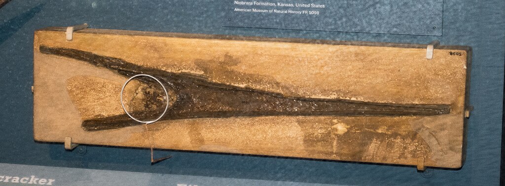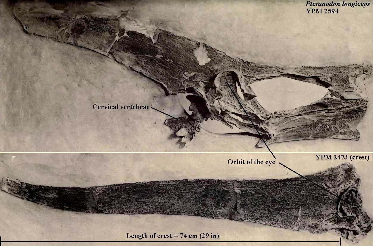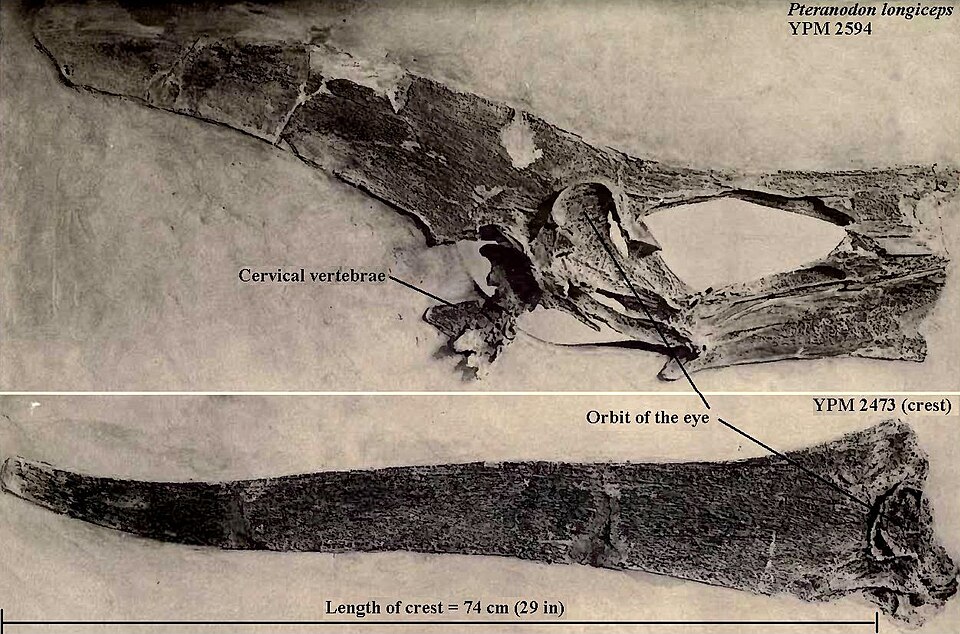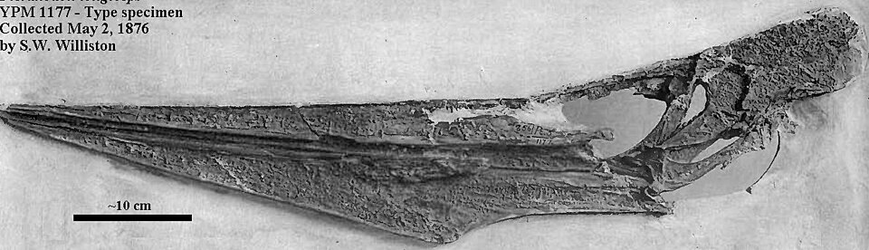 Alors que les premiers os d’ailes de ptéranodon ont été collectés par Marsh et Cope au début des années 1870, le premier crâne de ptéranodon a été trouvé le 2 mai 1876 le long de la rivière Smoky Hill dans le comté de Wallace (aujourd’hui le comté de Logan), au Kansas, aux États-Unis, par Samuel Wendell Williston, un collectionneur de fossiles travaillant pour Marsh. Un deuxième crâne, plus petit, a rapidement été découvert. Ces crânes ont montré que les ptérosaures d’Amérique du Nord étaient différents de toutes les espèces européennes, en ce sens qu’ils n’avaient pas de dents et avaient des crêtes osseuses sur leur crâne. Marsh a reconnu cette différence majeure, décrivant les spécimens comme « se distinguant de tous les genres précédemment connus de l’ordre des Ptérosaures par l’absence totale de dents ». Marsh a reconnu que cette caractéristique justifiait un nouveau genre, et il a inventé le nom de Pteranodon (« aile sans dent ») en 1876. Marsh a reclassifié toutes les espèces nord-américaines précédemment nommées, de Pterodactylus à Pteranodon. Il a considéré que le plus petit crâne appartenait à Pteranodon occidentalis, en fonction de sa taille. Marsh a classé le plus grand crâne, YPM 1117, dans la nouvelle espèce Pteranodon longiceps, qu’il pensait être une espèce de taille moyenne entre le petit P. occidentalis et le grand P. ingens. Marsh a également nommé plusieurs espèces supplémentaires : Pteranodon comptus et Pteranodon nanus ont été nommés d’après des squelettes fragmentaires de petits individus, tandis que Pteranodon gracilis était basé sur un os de l’aile qu’il a confondu avec un os pelvien. Il s’est vite rendu compte de son erreur et a reclassé ce spécimen dans un genre distinct, qu’il a nommé Nyctosaurus. Le P. nanus a également été reconnu plus tard comme un spécimen de Nyctosaurus.