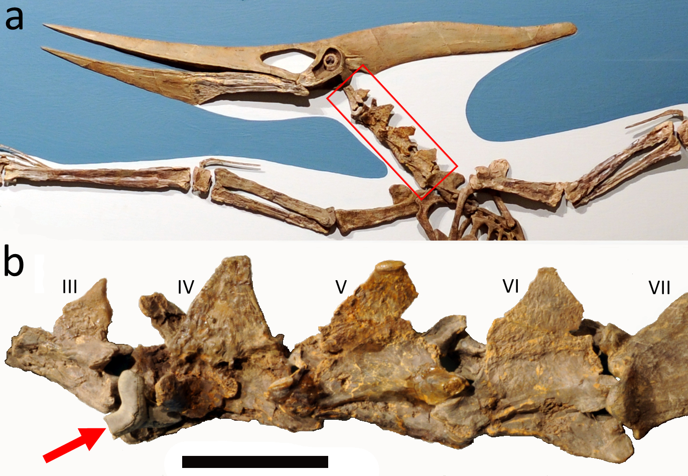 Les épines neurales des vertèbres du ptéranodon étaient étroites. Comme beaucoup de ptérosaures et d’oiseaux, il possédait un notarium, une masse soudée comprenant les 6 premières vertèbres dorsales. De même, les premières côtes ont été fusionnées. Les os pelviens ont été fusionnés au synsacrum, une masse de vertèbres qui comprenait au moins 2 vertèbres dorsales, les vertèbres sacrées et la première vertèbre caudale. Les sacrés étaient renforcés par des ligaments osseux. Au-delà du synsacrum, la queue était relativement courte et les dernières vertèbres étaient fusionnées en une tige osseuse. La longueur totale de la queue était d’environ 3,5% de la longueur de l’envergure des ailes, ou jusqu’à 25 cm (9,8 po) chez les plus grands mâles.