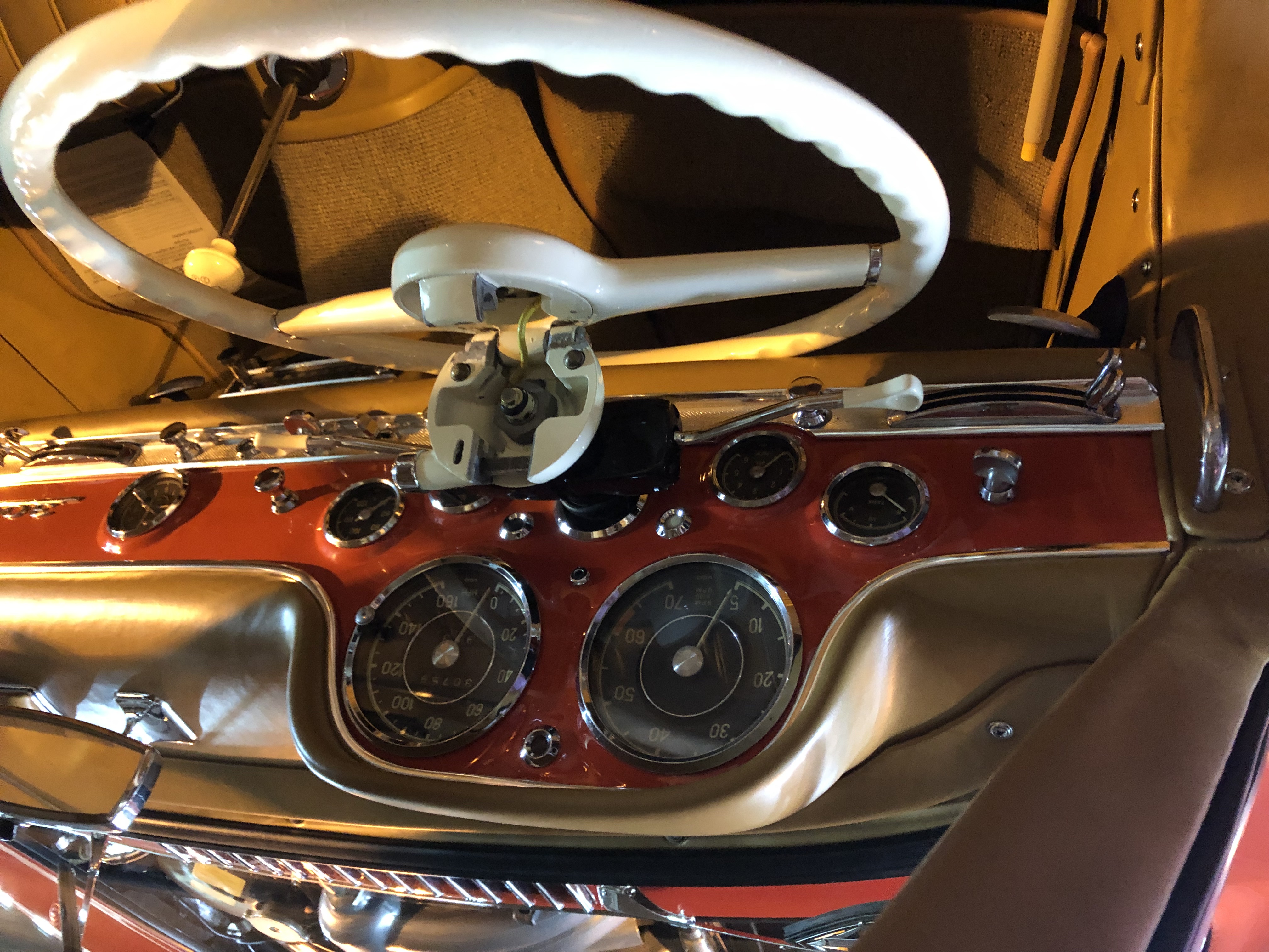 3 tissus de siège à carreaux étaient standard : gris et vert, gris et bleu, crème et rouge. La plupart des clients ont opté pour une sellerie en cuir, qui est devenue la norme sur le roadster. Avec des portes qui s’ouvrent vers le haut, le coupé a un seuil inhabituellement haut ; l’entrée et la sortie de la voiture sont problématiques. Le volant pivote sur son moyeu à 90 degrés du tableau de bord pour faciliter l’entrée. L’espace de rangement pour les bagages se trouve derrière les sièges du coupé ; le coffre ne contient qu’une roue de secours et un réservoir de carburant. Le roadster était disponible avec 2 valises en cuir sur mesure pour le coffre plus grand. Les vitres du coupé sont fixes et s’abaissent dans le roadster.