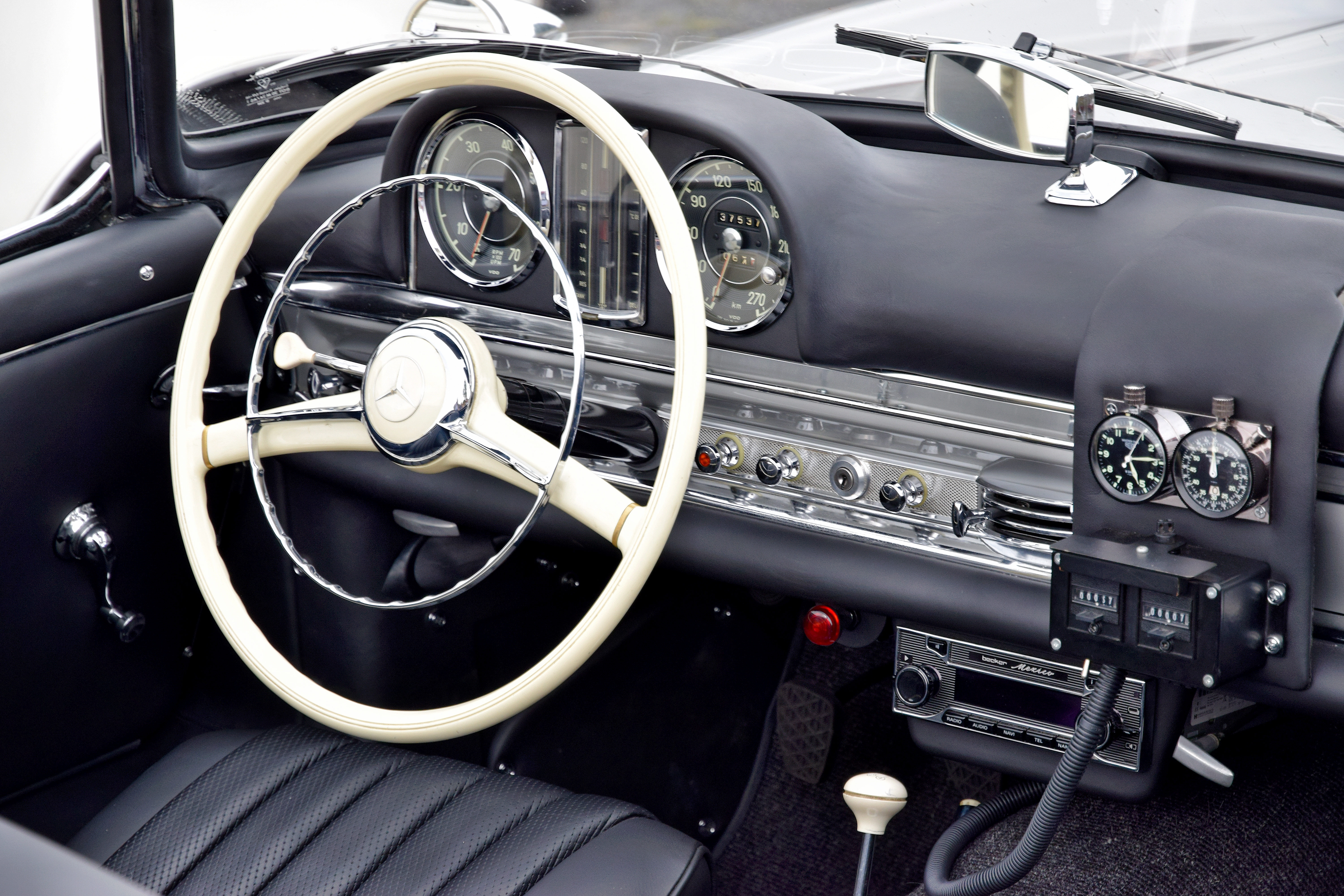 À l’origine, le roadster était équipé d’une capote escamotable. En septembre 1958, un toit rigide résistant aux intempéries en option est devenu disponible. Il s’est avéré être une option si attrayante que, malgré son prix considérable de 1'500 deutschemarks, il s’est avéré être l’option la plus populaire, de sorte que Mercedes a commencé à proposer le roadster sans la capote (pour une réduction de 750 deutschemarks par rapport à son prix de 1958 de 34'000 deutschemarks).