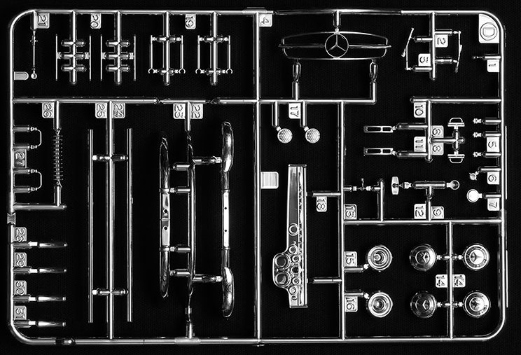 Le kit modèle en plastique Tamiya à l’échelle 1/24 de la Mercedes-Benz 300SL Full-view est une réédition modifiée de la sortie initiale de 2015 (no 24338). Comparé au numéro d’origine, il semble que la seule différence soit que les panneaux de carrosserie sont désormais moulés en styrène cristallin, et je parle bien de cristallin. Pour ceux qui souhaitent le construire ainsi, il n’y aura pratiquement aucun travail de préparation nécessaire sur le corps. Les joints de moulage sont presque invisibles, ce qui témoigne de la qualité des moules de Tamiya.