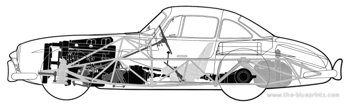 L’objectif de la conception globale était de rendre le véhicule aussi simple que possible. La largeur du cadre tubulaire le long du cockpit a permis d’incruster considérablement la ligne de toit de la cabine des 2 côtés, réduisant considérablement la surface avant. La structure était également assez haute entre les roues, interdisant la fixation de portes standard. La seule option – déjà utilisée sur la voiture de course W194 – qui permettrait aux passagers de franchir son seuil haut et profond était une porte papillon (.