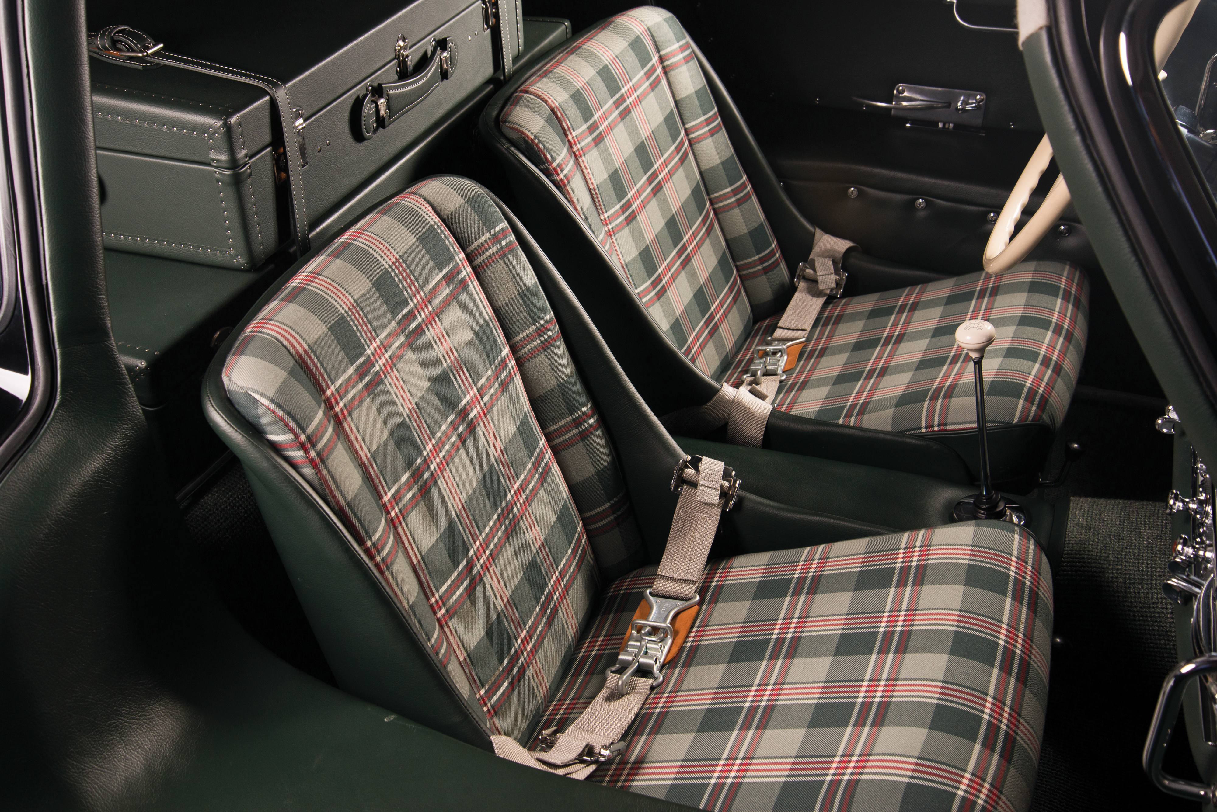 3 tissus de siège à carreaux étaient standard : gris et vert, gris et bleu, crème et rouge. La plupart des clients ont opté pour une sellerie en cuir, qui est devenue la norme sur le roadster. Avec des portes qui s’ouvrent vers le haut, le coupé a un seuil inhabituellement haut ; l’entrée et la sortie de la voiture sont problématiques. Le volant pivote sur son moyeu à 90 degrés du tableau de bord pour faciliter l’entrée. L’espace de rangement pour les bagages se trouve derrière les sièges du coupé ; le coffre ne contient qu’une roue de secours et un réservoir de carburant. Le roadster était disponible avec 2 valises en cuir sur mesure pour le coffre plus grand. Les vitres du coupé sont fixes et s’abaissent dans le roadster.